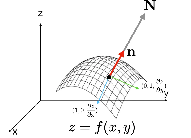 Surface Normal Vector 는 다음과 같이 방향의 tangential vector 와 방향의 tangential vector 의 cross product 를 통해 구할 수 있음.