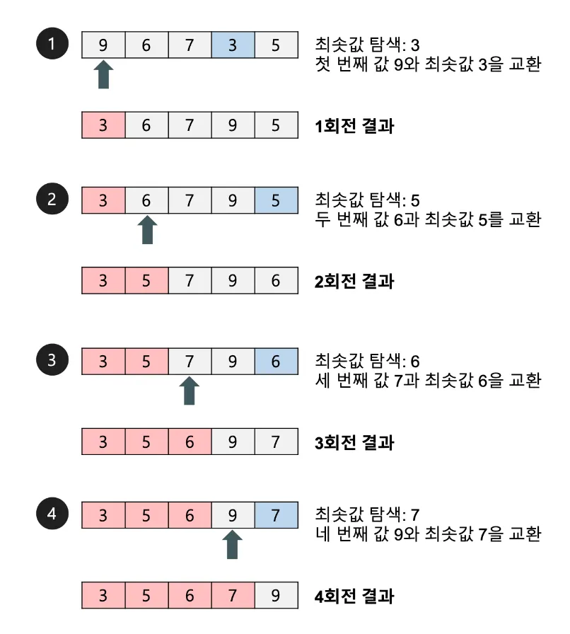 전체를 순회하여 최솟값을 찾아 처음에 둠
