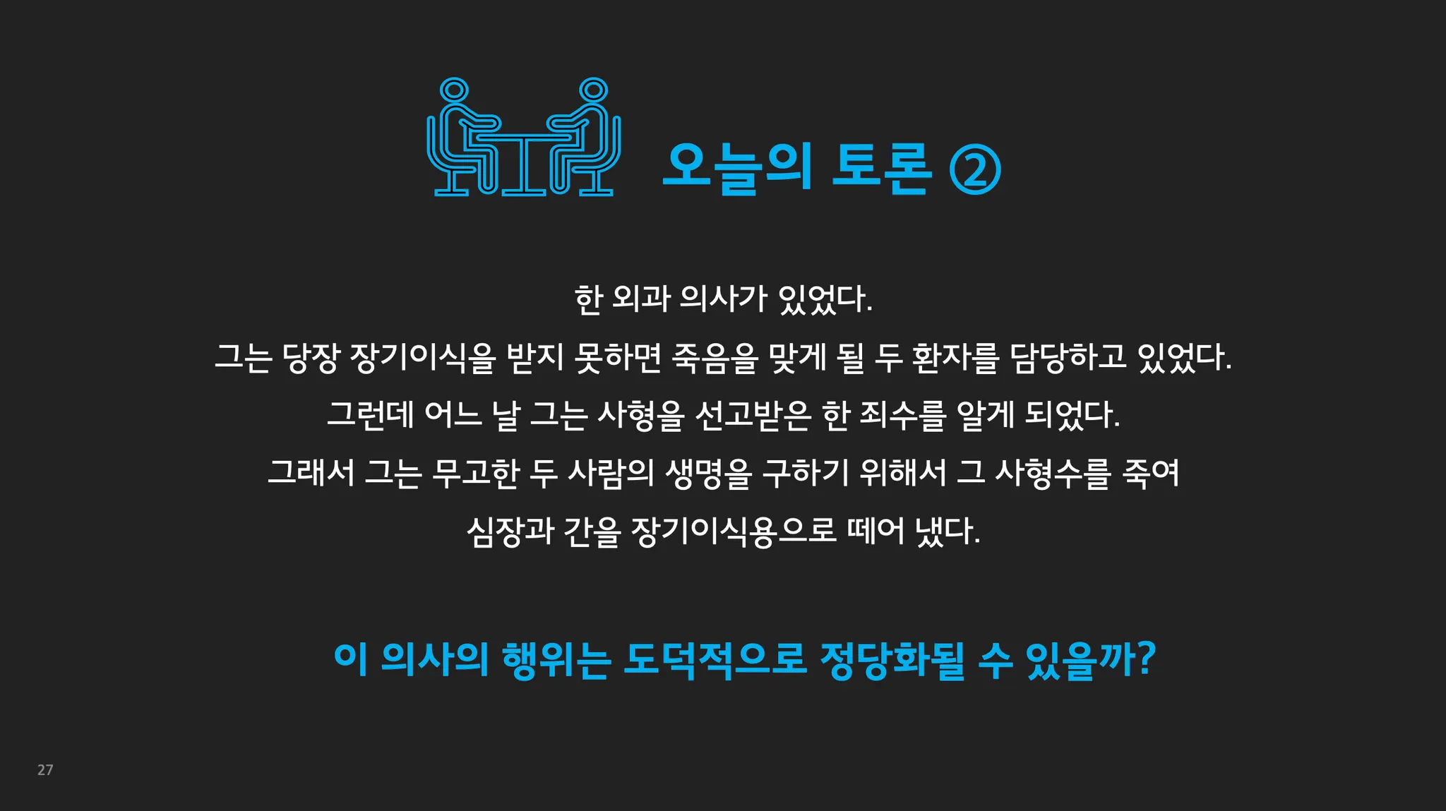 하지만, 해악 금지의 원칙보다는 명료하지는 않지만 일반적인 인간의 생존 본능에 기반하면 자율성 존중의 원칙을 위반했을 가능성이 높다는 점은 여전히 유효하며, 더욱이 의사가 공리주의적인 윤리적 가치에 기반하여 행위를 했는지 단순히 사형수가 싫어서 살해를 했는지가 명백하지는 않습니다. 반대로 의무주의론적인 관점에서 판단했을 때는 의사의 행위는 옳은 행위로 볼 수 없는 것이 명백합니다. 의사의 행위가 옳지 못한 행위가 명백한 상황에서 도덕적으로 정당화될 수 있는 가능성은 있지만, 그러려면 앞서 이야기했던 의사의 윤리적 가치가 명백히 드러나는 상황에서만 가능하다고 생각하며 이 경우에는 그렇지 못하기 때문에 도덕적으로 정당화를 인정할 수 없어 보입니다.