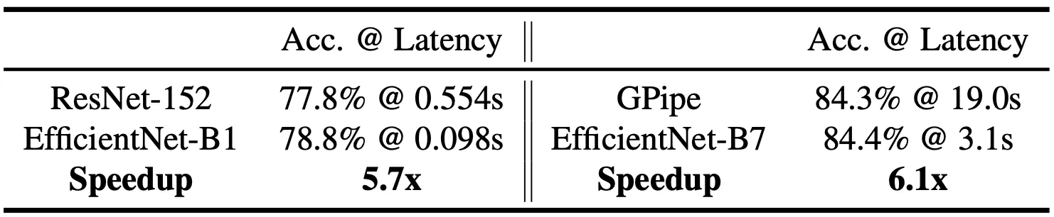 EfficientNet-B1 과 ResNet-152 는 accuracy 가 비슷한 두 네트워크인 반면 Latency 는 5.7 배 가량 EfficientNet 이 빠른 것으로 나타났습니다. 더불어 EfficientNet-B7 은 accuracy 가 비슷한 네트워크인 GPipe 에 비해서 6.1 배 가량 빠른 것으로 나타났습니다. 이러한 결과는 EfficientNet 가 실제 하드웨어 상에서도 빠르다는 것을 보여주는 결과로 해석할 수 있습니다.