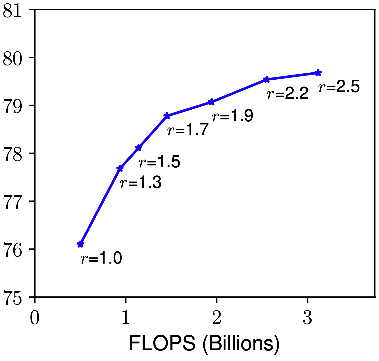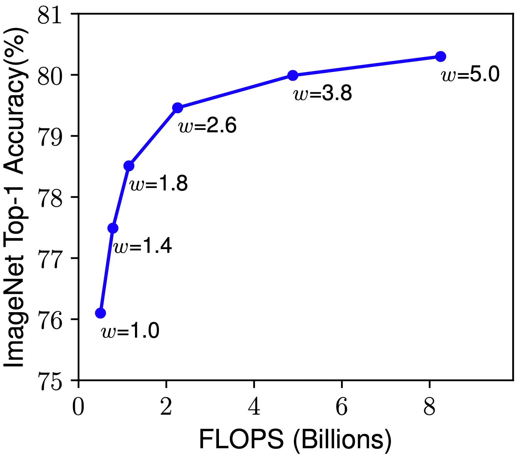 하지만, 마찬가지로 논문에서는 baseline 네트워크의 값을 변화시켜 가면서 네트워크의 성능을 측정해보았습니다. 그 결과 위의 그림과 같이 일반적으로는 값이 증가함에 따라 네트워크의 성능도 증가했지만, 값의 증가로 얻는 성능 증가량이 점점 적어지는 모습을 볼 수 있었습니다.