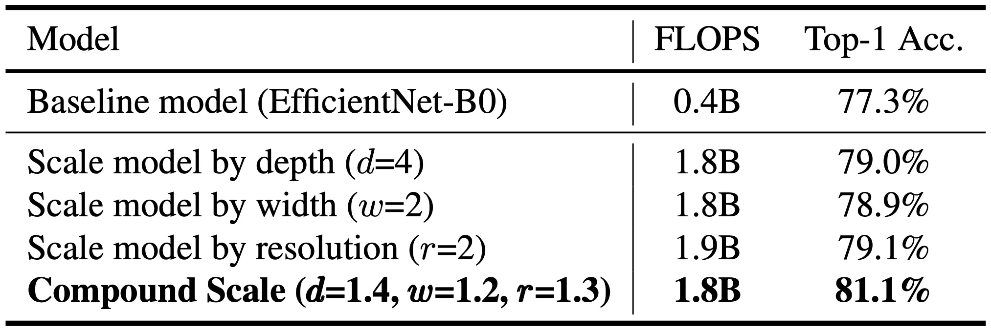 이러한 직관은 기존의 single-dimension scaling 에서 벗어나 균형있게 각 dimension 요소들을 Scaling-Up 해야할 필요성을 제안해줍니다.