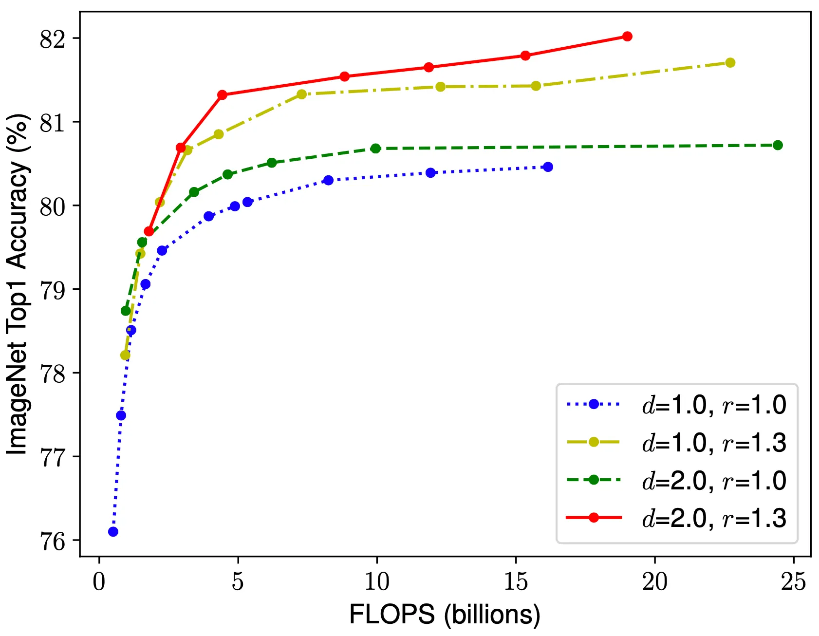 이러한 직관을 실험적으로 증명해보이기 위해서 논문에서는 을 고정시킨 채 를 변화시켜가면서 측정한ImageNet top-1 accuracy 의 변화를 제시합니다. 그 결과 고정시킨 값이 모두 큰 경우에 대해서 전체적으로 성능이 좋았음을 볼 수 있었습니다. 이 결과가 시사하는 바는 하나의 dimension scale 에 대해서 최적의 값을 찾았더라도, 다른 dimension 의 조절을 통해서 충분히 더 좋은 값을 찾을 수 있다는 것입니다.