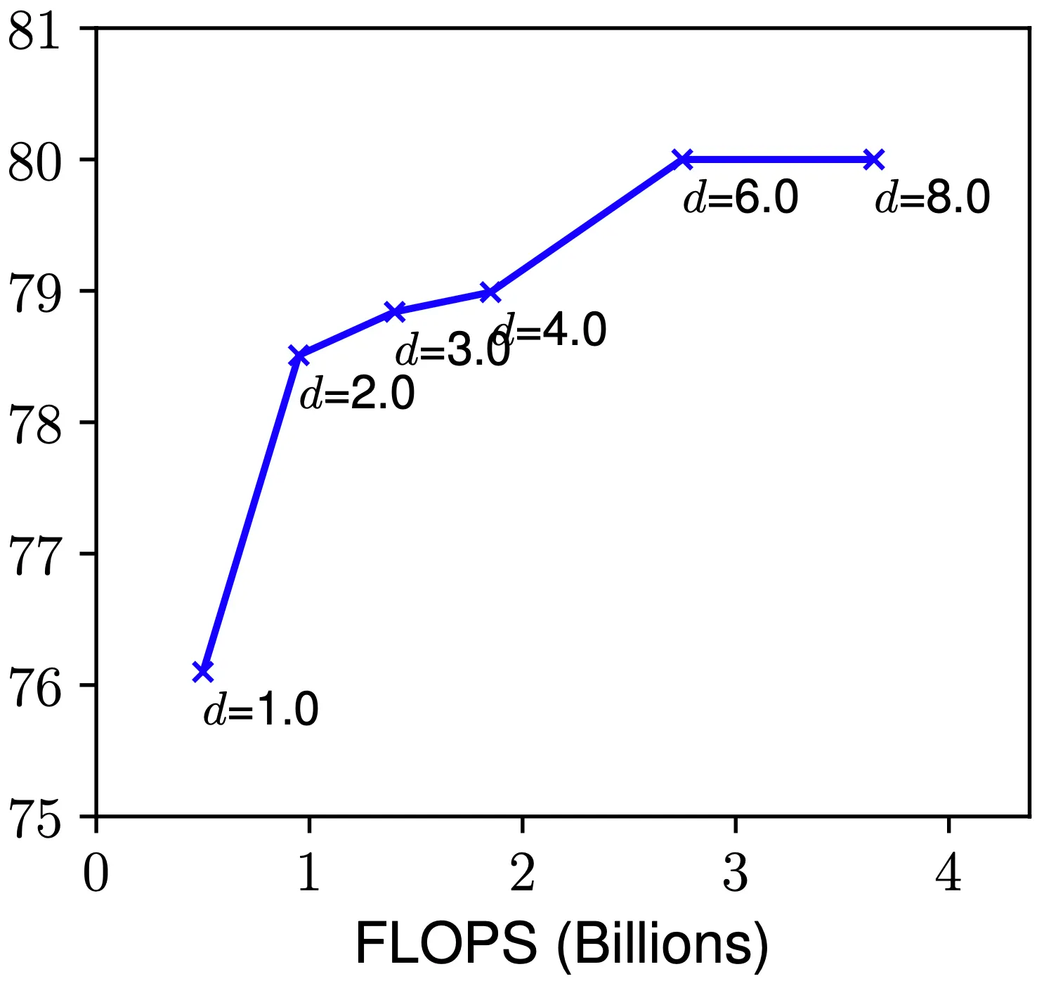 이는 이 FLOPS 에 미치는 영향의 정도가 다르기 때문입니다. 의 경우에는 2 배의 증가가 단순히 같은 네트워크 연산의 한 번 더 반복이라서 FLOPS 의 2 배 증가로 이어지지만, 같은 경우에는 2 배의 증가가 convolution 연산에서 가로와 세로로 탐색해야 할 영역이 각각 2 배가 되기 때문에 FLOPS 의 4 배 증가로 이어지게 됩니다.