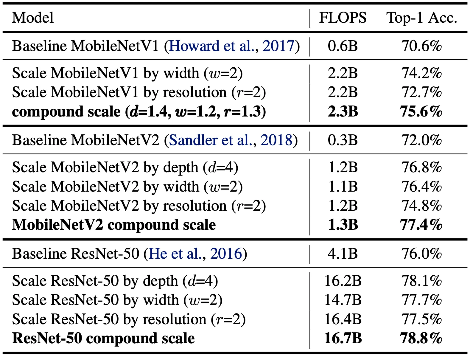 Howard et al. 의 MobileNet-v1, Sandler et al. 의 MobileNet-v2, He et al. 의 ResNet 이 실제로 baseline 네트워크로 사용되었고 세 baseline 네트워크 모두 하나의 dimension 을 사용해서 scaling 한 결과보다 유의미하게 증가한 top-1 accuracy 를 확인할 수 있었습니다. 이 결과가 논문의 방법론이 실제로 효과가 있음을 뒷받침한다고 주장합니다.