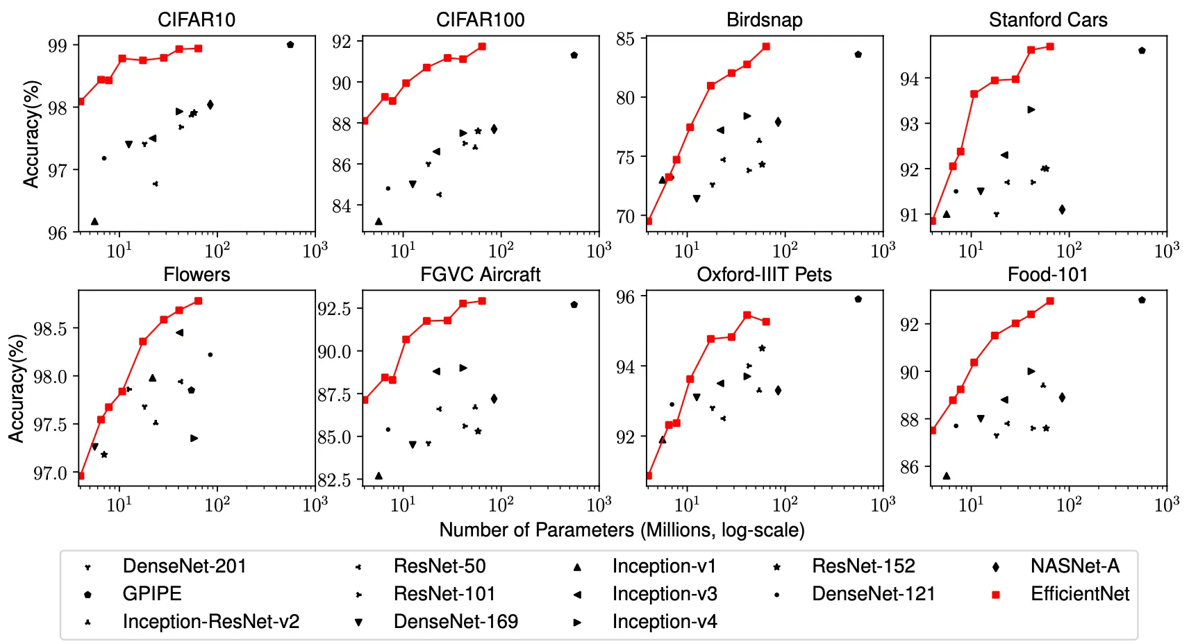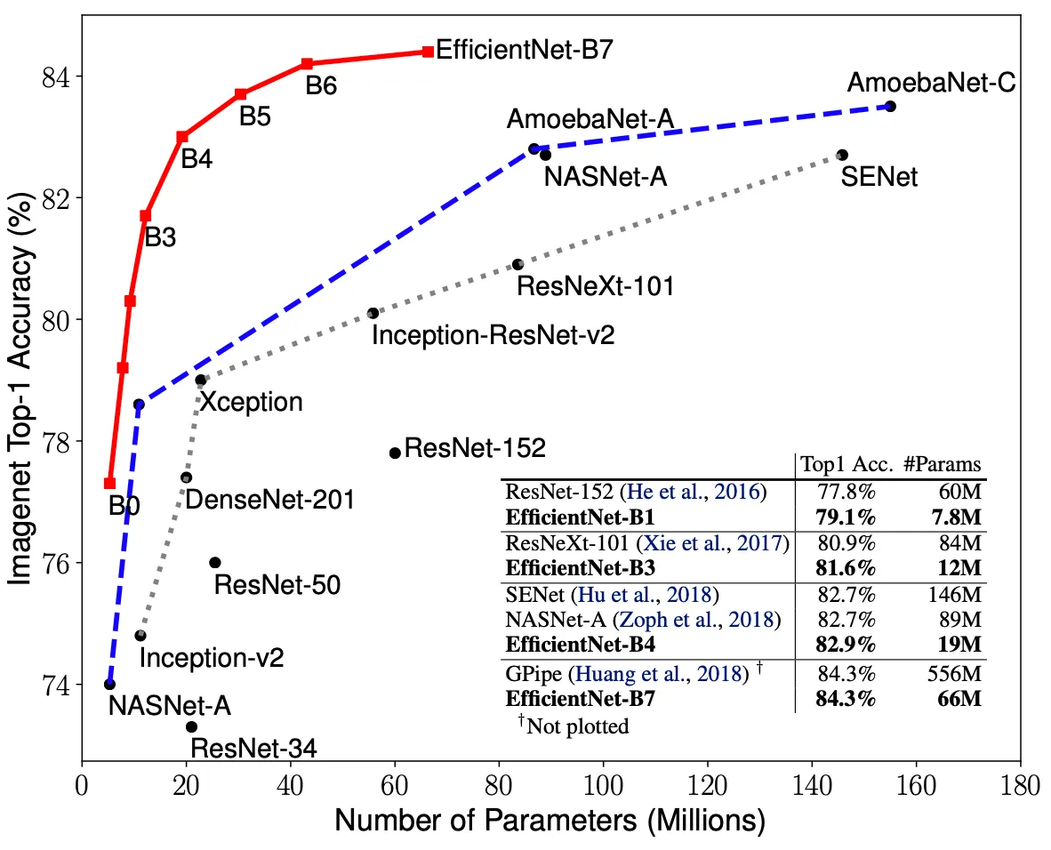 위의 그래프는 accuracy-parameter 의 그래프로 EfficientNet 이 일반적으로 다른 Convolutional Neural Network 에 비해서 적은 수의 parameter 를 가지고도 더 높은 accuracy 를 가짐을 시각적으로 알 수 있습니다.