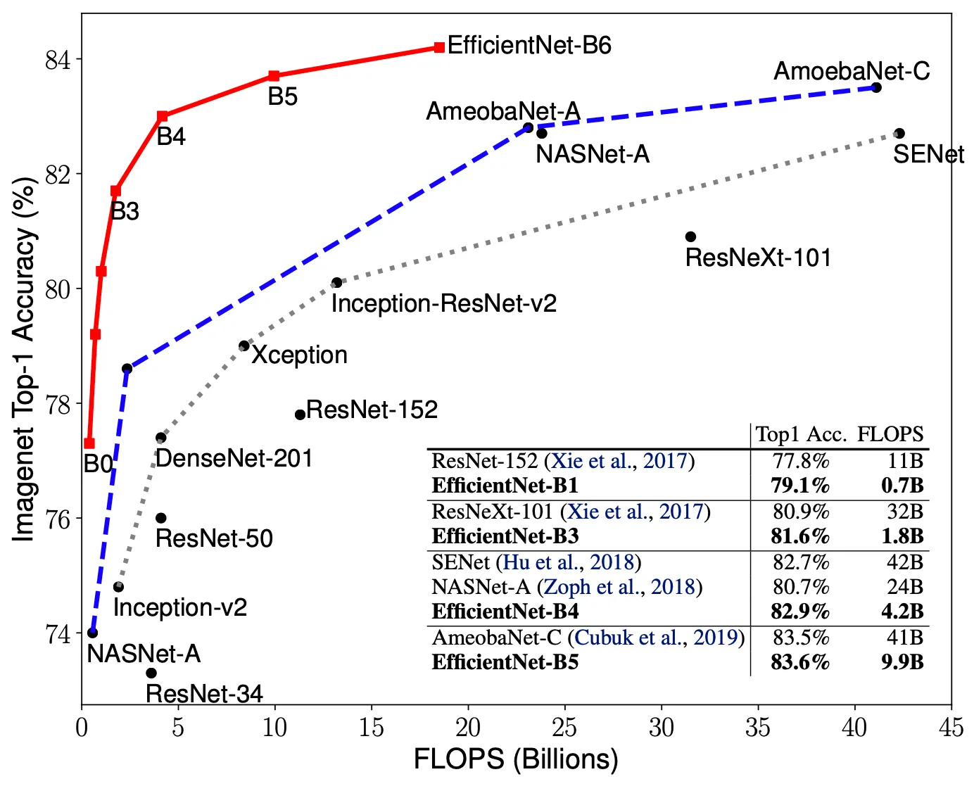 논문의 배경은 Convolutional Neural Network 가 좋은 성능을 얻기 위한 접근으로 Scaling-Up 이 자주 사용되던 트렌드로부터 시작합니다. 실제로 2016 년에 등장한 ResNet 은 ResNet-18 에서 ResNet-200 으로 네트워크의 깊이를 늘림으로써 scaling-up 을 진행했고, 2018 년에 등장한 Gpipe 는 baseline 모델을 4배 정도 키워서 ImageNet top-1 accuracy 84.3% 를 달성했습니다.
