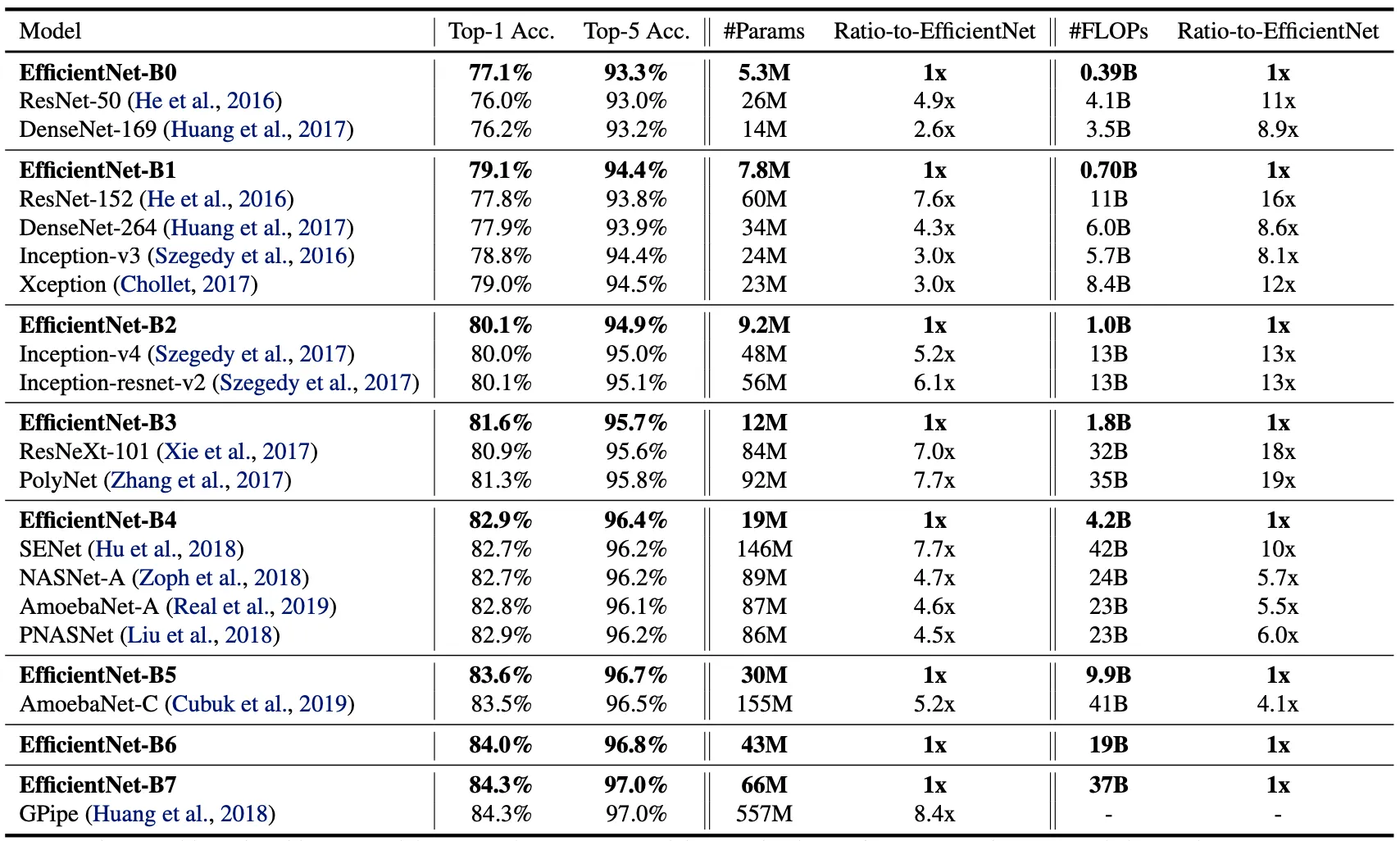NASNet-A 와 Inception-v4 와 같은 public available model 과의 비슷한 accuracy 를 낸 EfficientNet 의 parameter 수를 각각 비교하면 EfficientNet 이 평균적으로 4.7 배 정도 적은 paramter 를 사용했고, 최대 21 배 적은 경우도 존재했습니다.