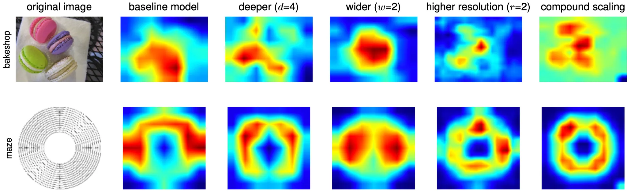 더불어 논문에서는 위의 5 가지 구성의 class activation map 의 그림을 제시하면서 compound scaling 이 이미지가 표현하는 물체의 관련 구역에 더 집중된 활성도를 가짐을 보여주었습니다. 그에 비해서 다른 single-dimension scaling 은 물체의 세부적인 디테일이 부족하거나 물체를 아예 인식하지 못하는 듯한 활성도를 보여주었습니다.
