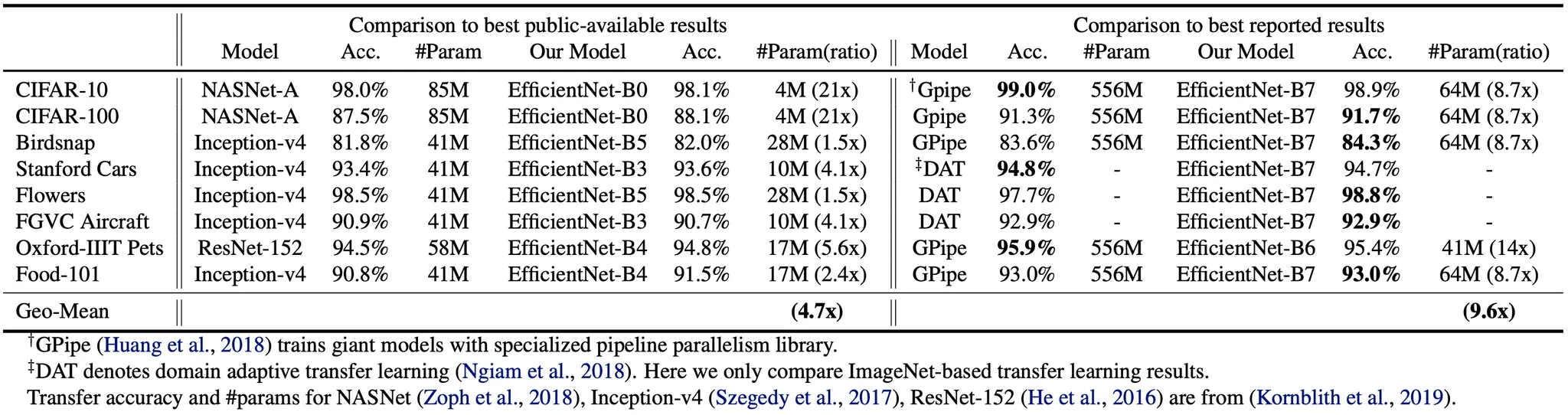 자체적으로 training data 를 동적으로 생성해내는 DAT 와 특별한 병렬 pipeline 을 활용하는 GPipe 등 SOTA model 과의 비슷한 accuracy 를 낸 EfficientNet 를 비교해보면 여전히 8 개의 비교 중 5 개의 경우에 대해서 더 좋은 accuracy 를 가짐을 확인할 수 있었고, EfficientNet 이 대략 9.6 배 정도 적은 parameter 수를 가지고 있음을 확인할 수 있었습니다.