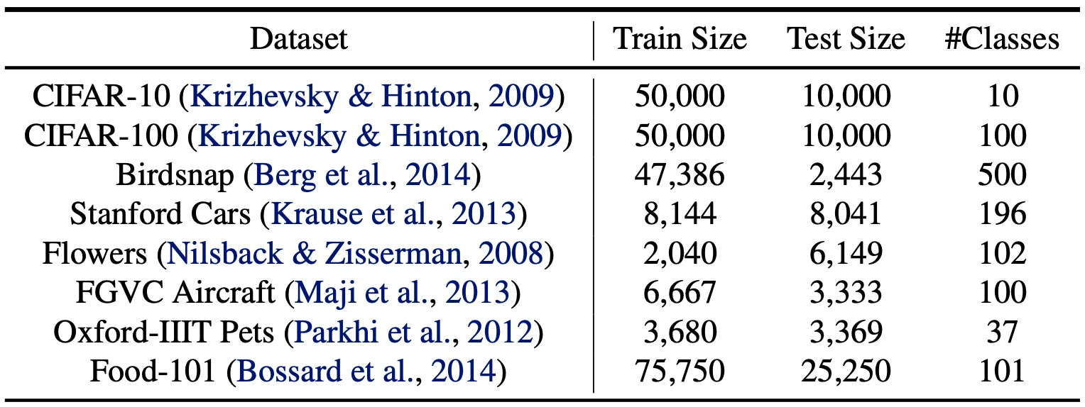논문에서는 ImageNet 에서 벗어나 일반적으로 transfer learning 에 쓰이는 dataset 으로도 평가를 진행했습니다. 사용한 dataset 들의 정보는 아래의 표에 열거되어 있습니다.