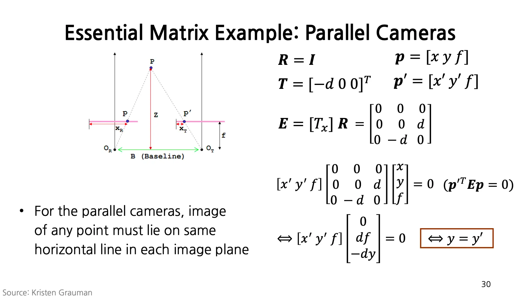 Parallel 한 camera 의 경우 한 이미지의 특정 점과 대응되는 점은 다른 이미지와 같은 horizontal line 위에 놓여 있음을 알 수 있음.