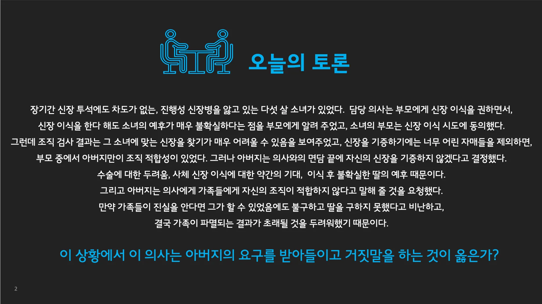 하지만 행위의 옳고 그름을 판단해야할 때는 조금 다른 문제입니다. 내가 조절할 수 없는 불확실한 미래의 요소를 생각하면서 내가 할 행위의 옳고 그름을 판단하면 안되고 현재 주어진 상황을 가지고만 옳고 그름을 판단해야 합니다. 의사에게 현재 주어진 상황은 아버지의 요구를 받아들이고 거짓말을 할 것인가? 이며 의사의 행위로 인해 연쇄적으로 나타날 수 있는 불확실한 아버지의 최종적인 판단, 딸의 예후 등은 옳고 그름의 판단에 기여해서는 안된다고 생각합니다. 이러한 점을 살펴보았을 때 의사의 현재 상황에만 기반하여 거짓말을 하는 것은 옳지 않다- 라는 일반적인 의무주의론적 관점에서 거짓말을 해서는 안된다고 생각합니다.