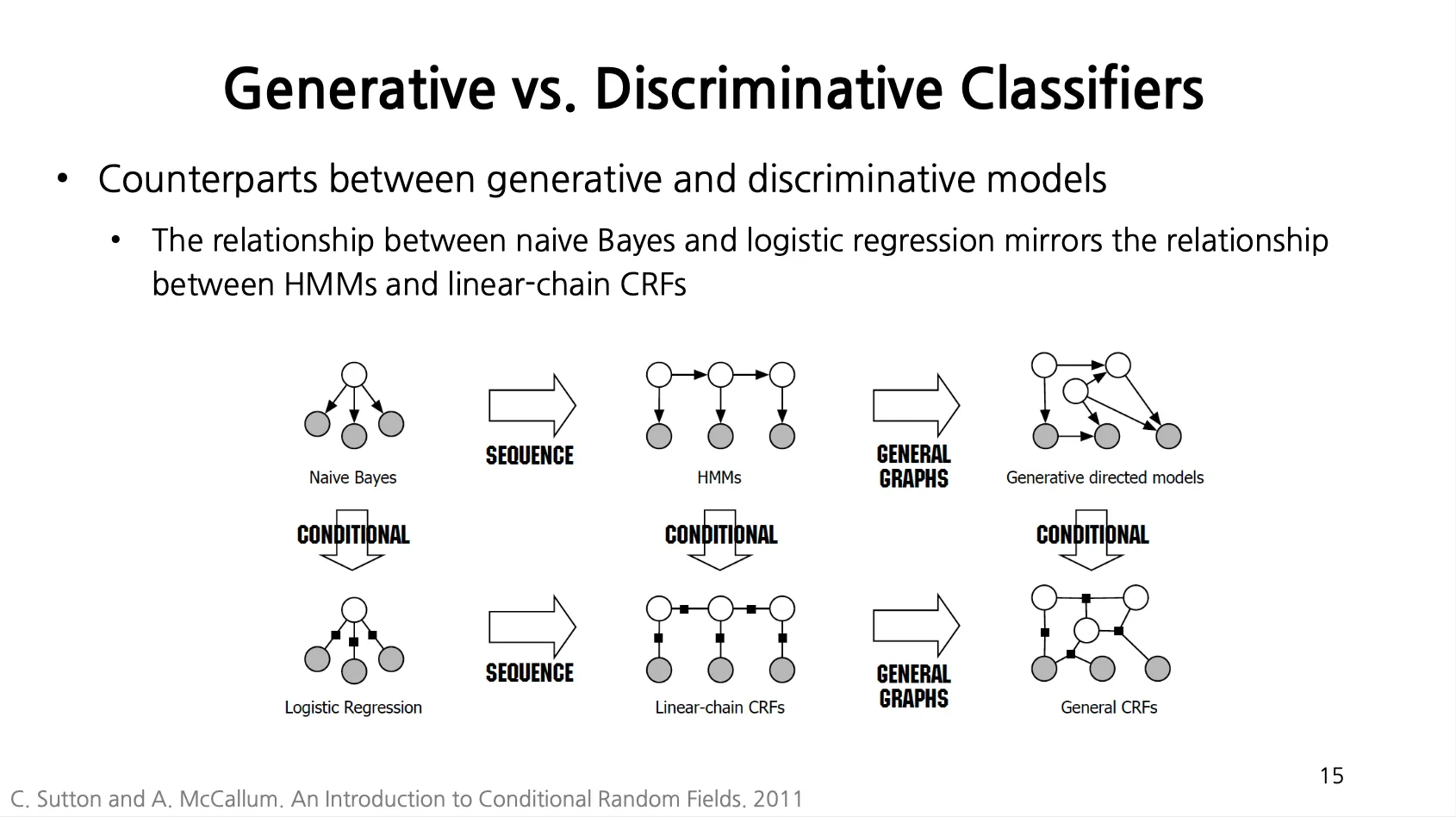 Naive Bayes, Logistic Regression 을 각각 sequence 모델로 변형한게 HMMs, Linear-Chain CRFs 임.