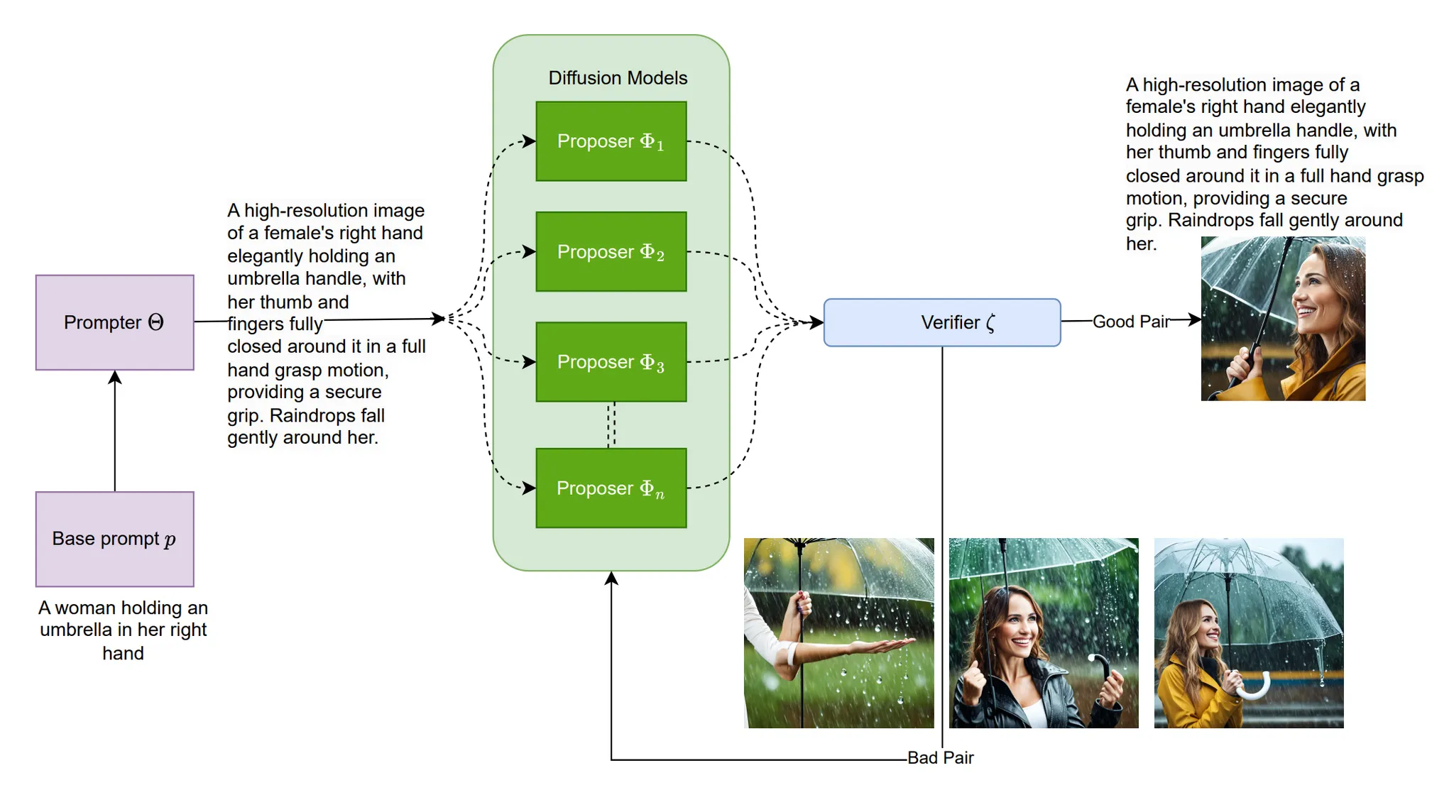 생성한 디테일한 prompt 를 다양한 Proposer 모델에 넣어 이미지들을 생성함.