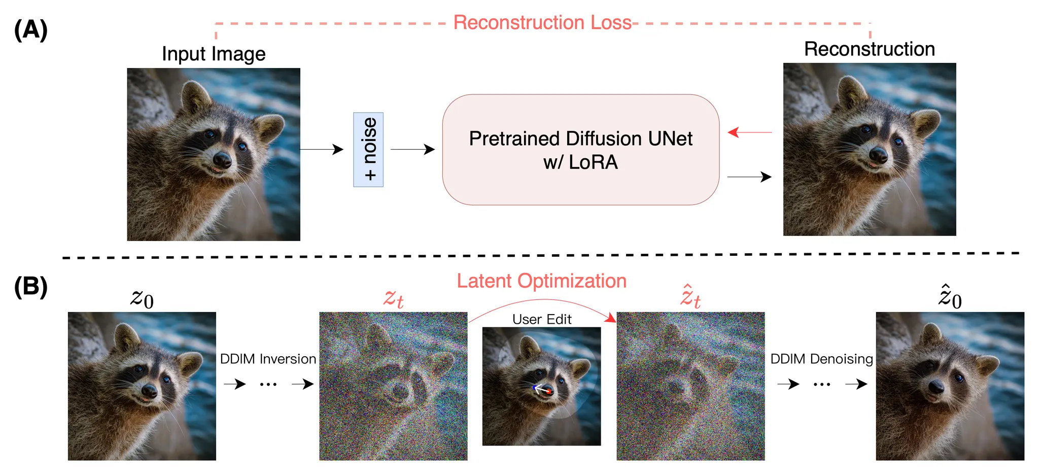 첫 번째 단계에서 LoRA 를 이용해 주어진 이미지에 대한 fine-tuning 을 진행함. 이는 두 번째 단계에서 의도하지 않은 결과로 denoising 되는 현상을 최소화하기 위한 것으로 보임.