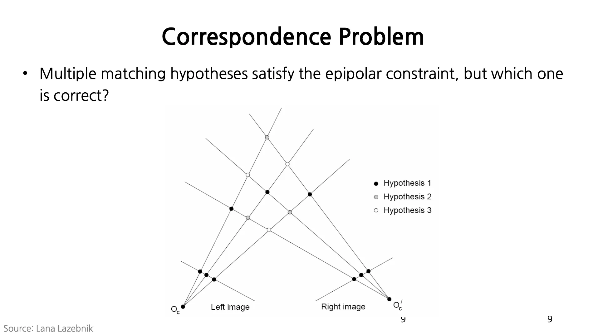 Multiple Matching Hypotheses 들 모두가 Epipolar constraint 를 만족하지만, 어느 것이 옳은지는 알 수 없음