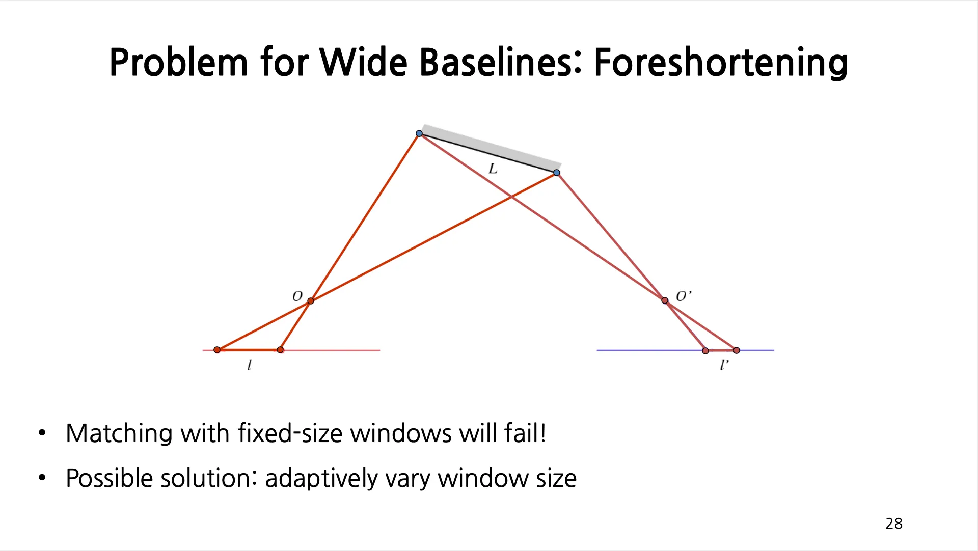 고정된 크기의 windows 는 corresponding point 를 찾기 어려움. → Adaptive 하게 window size 를 변경할 수는 있긴 한데, 대게 많은 경우에 이 과정이 어려움.