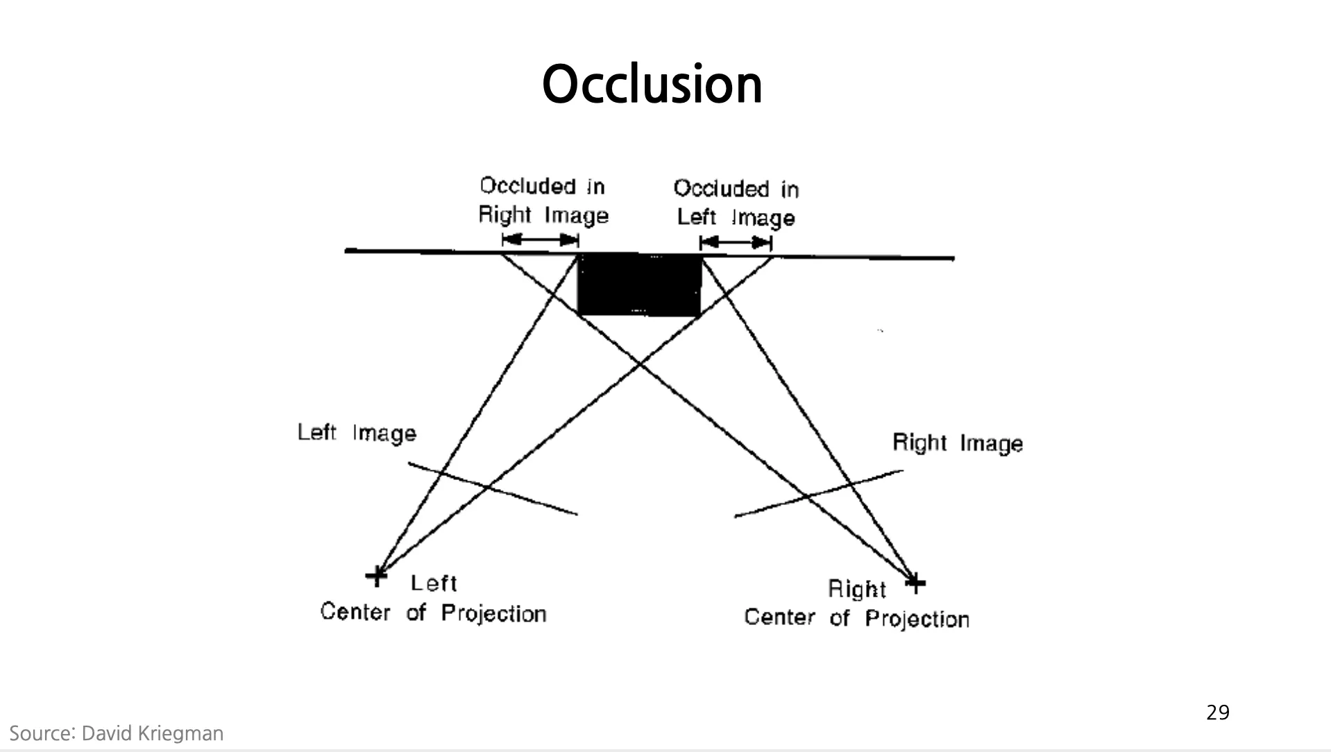 한 쪽 이미지에서는 보이지만, 다른 이미지에서는 보이지 않는 occlusion 이 있을 때는 근원적으로 corresponding point 를 찾을 수 없음.