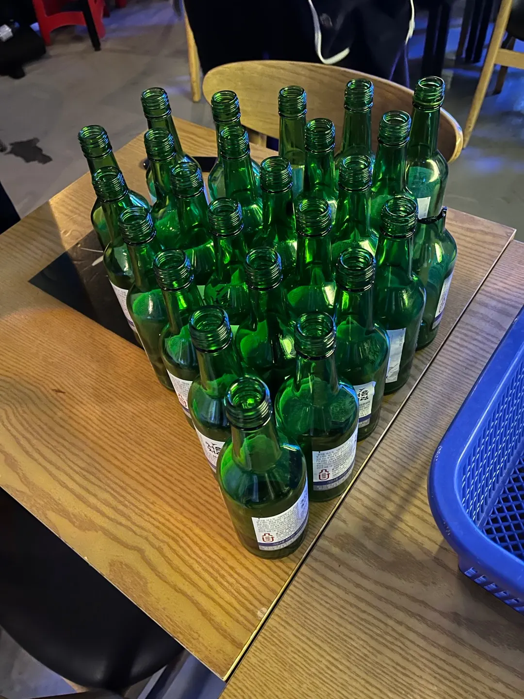 나무 책상 위 올려져 있는 25 개의 빈 소주병과 1 개의 깨진 소주병