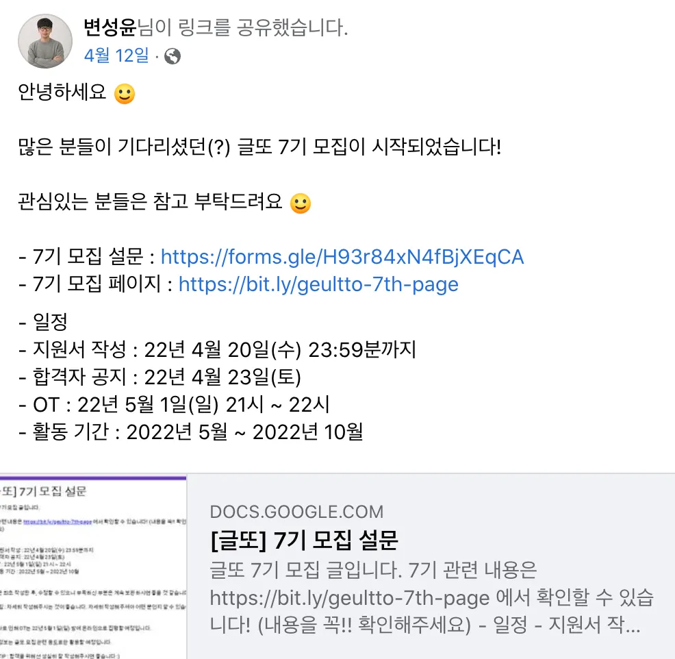 아이러니하게도 글또 6기에 참여하고 싶었는데 해당 모집 기간이 제가 산업기능요원 훈련소에 다녀온 기간에 정확하게 포함이 되어 있어서 참여하지 못했던 안타까운 기억이 있었는데, 이걸 알고 있는 분께서 저에게 추천을 해주신 것이었습니다.
