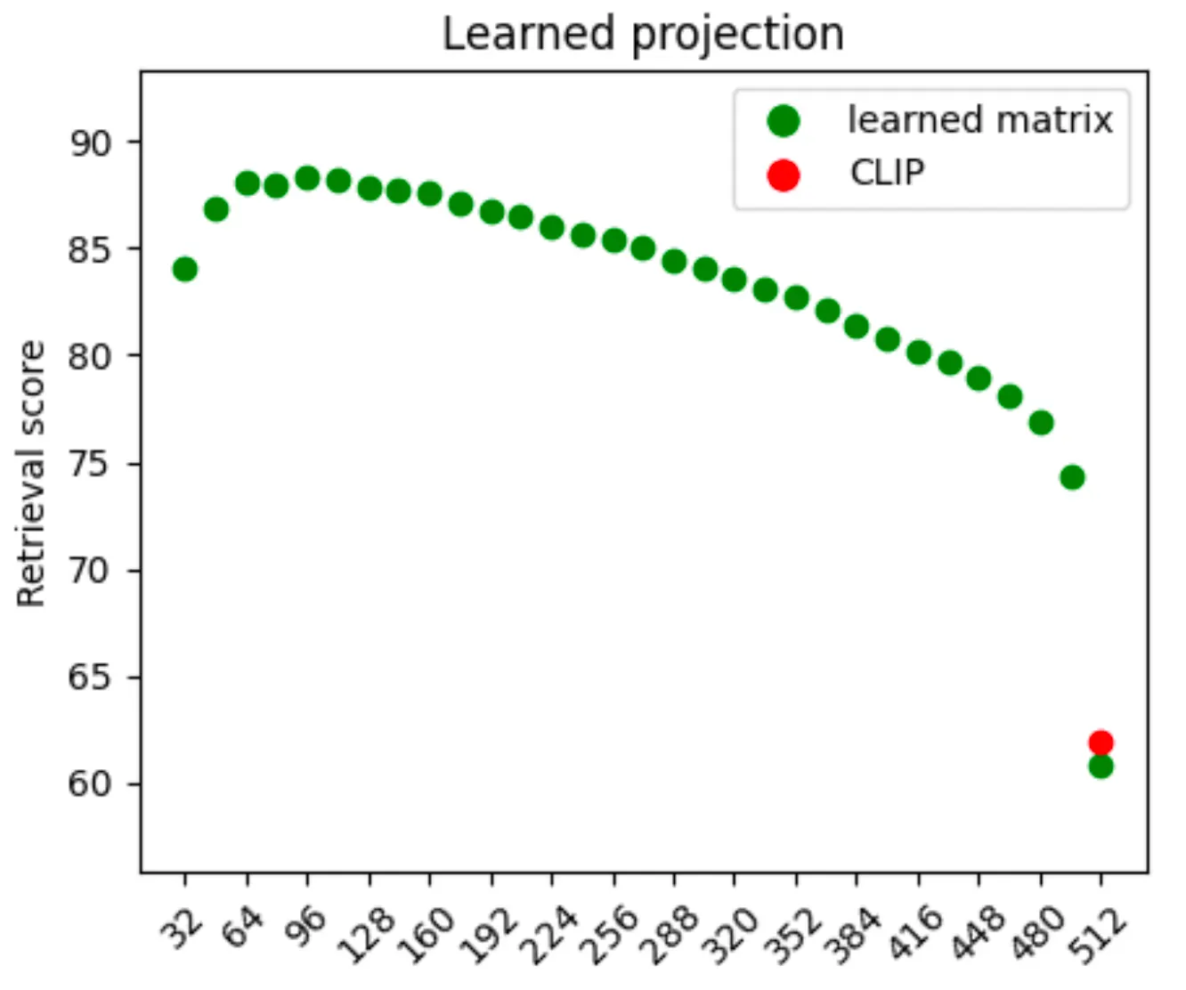 처음에 128 dimension 으로의 projection setting 을 활용해 진행한 실험 결과는 testing 할 때 전체 데이터셋을 retrieval 할 수 없어서 생긴 out-of-domain 이슈가 있음에도 불구하고 기존의 CLIP 모델에 비해서 1.76% 정도밖에 안낮은 retrieval score 를 얻을 수 있었습니다. 전체 데이터셋으로 실험을 한 결과 기존의 CLIP 모델보다 0.2% 정도 상향된 성능을 보였습니다.