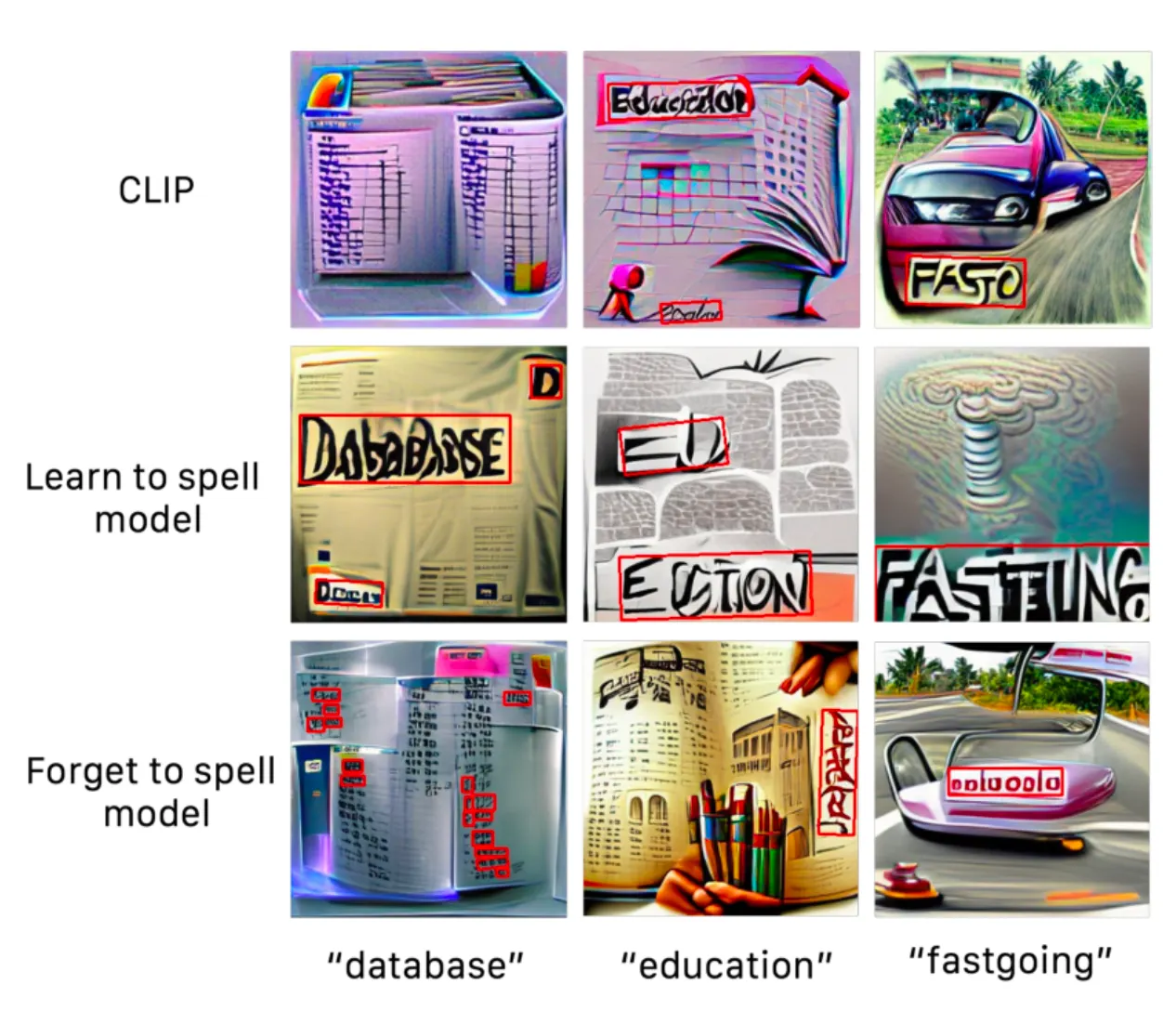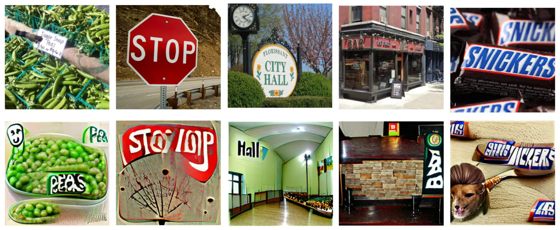 위 그림은 리뷰 초반에서도 등장한 사진인데, 기존 CLIP 을 활용을 할 경우 위 그림의 두 번째 행과 같이 의미적으로도 유사하지만 텍스트 또한 직접적으로 이미지 속에 삽입된 형태의 그림들이 생성되는 이슈가 있었습니다.