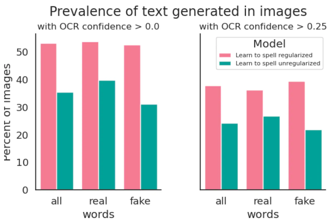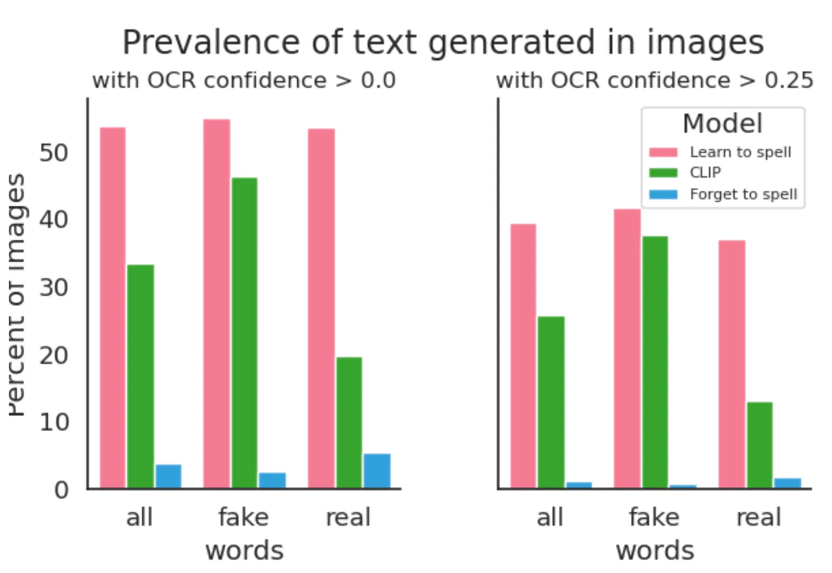 위의 그림과 같이 모든 단어에 대해서 Learn To Spell Model 은 기존의 모델에 비해서 25.43% 높은, Forget To Spell Model 에 비해서 54.92% 높은 텍스트 등장 비율을 보였습니다. 이 차이는 실제 영단어의 경우만 추려서 보면 더욱 커지는 것을 확인할 수 있었습니다. 이는 논문에서 언급한 Qualitative Analysis 가 적용되었기 때문도 있지만, 넌센스 단어의 경우 기존 CLIP 모델이 표현할 형태가 텍스트 뿐이기 때문도 있는 것으로 보입니다. 그리고 이는 논문에서 언급한 대로 넌센스 단어에서 CLIP 모델의 텍스트 등장 비율이 높은 이유이기도 합니다.