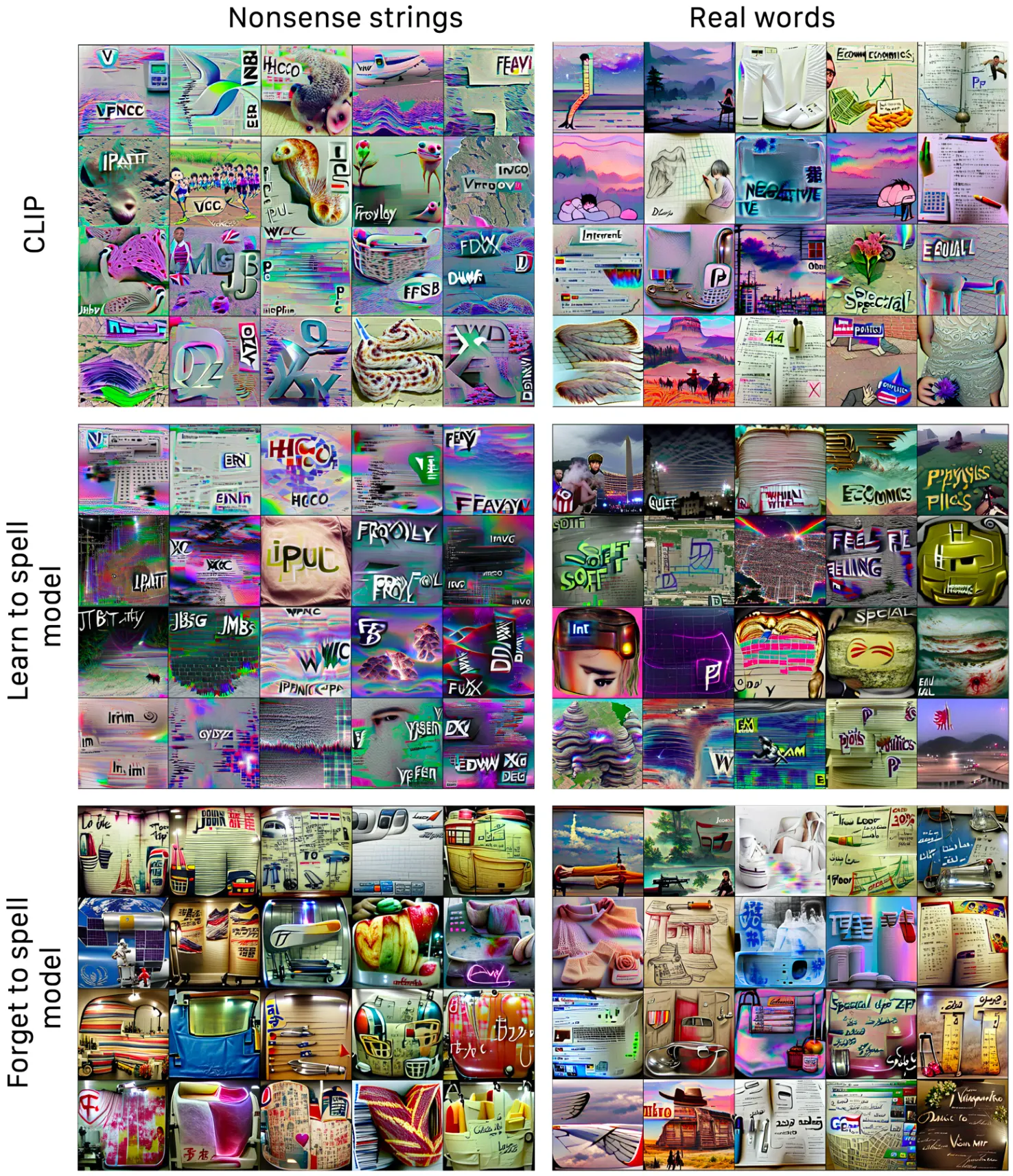 위 그림은 논문에서 학습한 Learn To Spell Model 과 Forget To Spell Model 을 VQGAN 과 함께 이용하여 생성한 이미지들입니다. 전반적으로 넌센스 단어에 대한 Learn To Spell Model 이 실제 영단어에 대한 Learn To Spell Model 에 비해서 텍스트가 잘 드러나는 모습을 보이는데 논문에서는 이러한 현상에 대해 넌센스 단어는 일반적으로 시각적 정보를 가지고 있지 않기 때문에 시각적으로 표현될 수 있는 여지가 없기 때문에 모델이 해당 단어를 텍스트 형태로만 표현할 수 있어서-로 보고 있습니다.