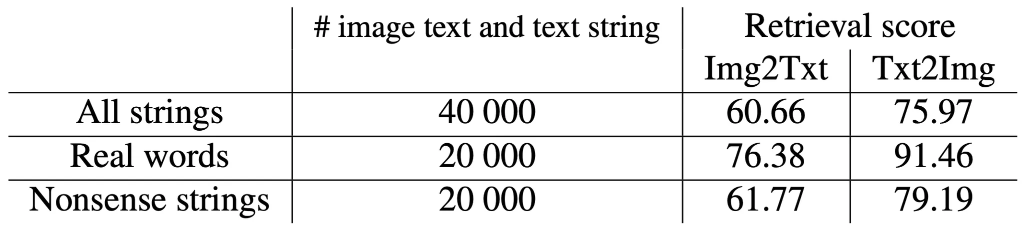 위 그림의 좌측과 같은 Image Text 를 CLIP 의 Image Encoder 에 넣고 우측과 같은 Text String 을 Text Encoder 에 넣어서 각각의 벡터를 뽑아낸 뒤, 각 벡터들마다 서로 다른 encoder 에서 encoding 된 벡터 중에서 가장 높은 유사도를 가지는 벡터를 retrieval 해내는 방법으로 matching 을 진행합니다. (Text 에서 Image 방향으로, Image 에서 Text 방향으로 모두). 이 때 사용한 텍스트들은 실제 존재하는 영단어 (Real English Word) 와 3~8 의 길이를 가진 랜덤하게 sampling 된 알파벳의 조합으로 구성한 넌센스단어를 모두 포함하도록 설계합니다. 그렇게 matching 해낸 것들 중 옳은 matching 의 비중을 retrieval score 로 지칭하였고 다음과 같이 나타났다고 합니다.