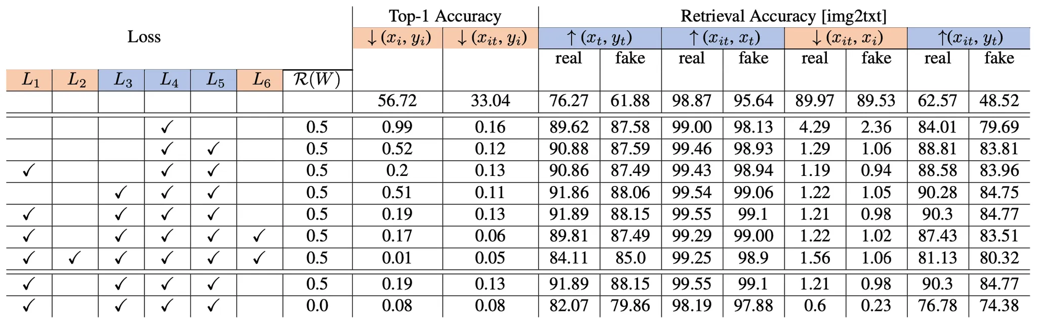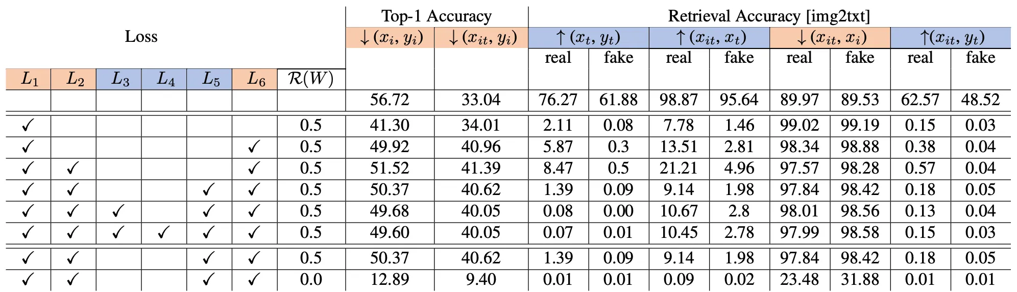 이렇게 projection dimension 을 먼저 결정한 뒤, 논문에서는 앞서 설계한 loss 항목들에 대한 ablation study 를 제공합니다. 앞서 Visual Comprehension 에서 이야기한 두 가지 실험 1. Matching Natural Images with Image Text, 2. Matching Image Text with Text String 를 진행하여 Learn To Spell Model, Forget To Spell Model 각각에 대해 평가를 진행했습니다.