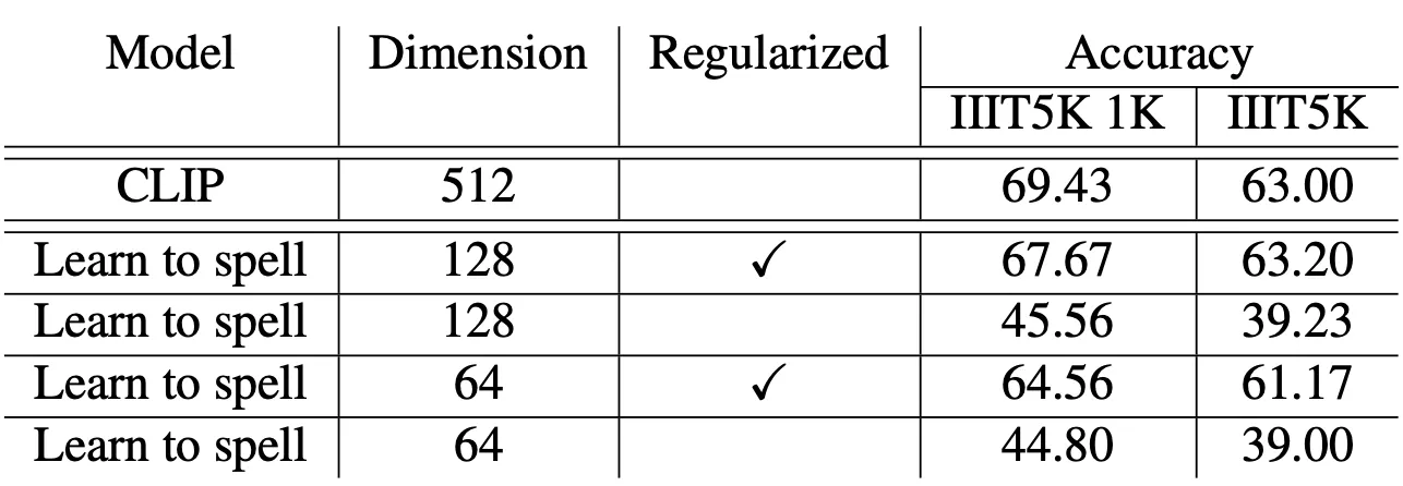 그 결과 Learn To Spell Model 의 경우 기존의 CLIP 이 가지고 있는 512 dimension 에서는 단순히 projection 이 rotation 만을 의미하기 때문에 CLIP 의 성능에서 크게 변하지 않은 것을 확인할 수 있었습니다. 가장 높은 score 를 얻은 것은 512 → 64 dimension 으로의 projection 이었고, 해당 dimension 이 Written Text 를 이해하는데 충분한 크기의 dimension 이라는 사실을 역으로 알 수 있었다고 합니다. Forget To Spell Model 의 경우에는 512 → 256 projection 이 가장 높은 성능을 보였고 해당 dimension 으로의 projection 을 활용했다고 합니다.