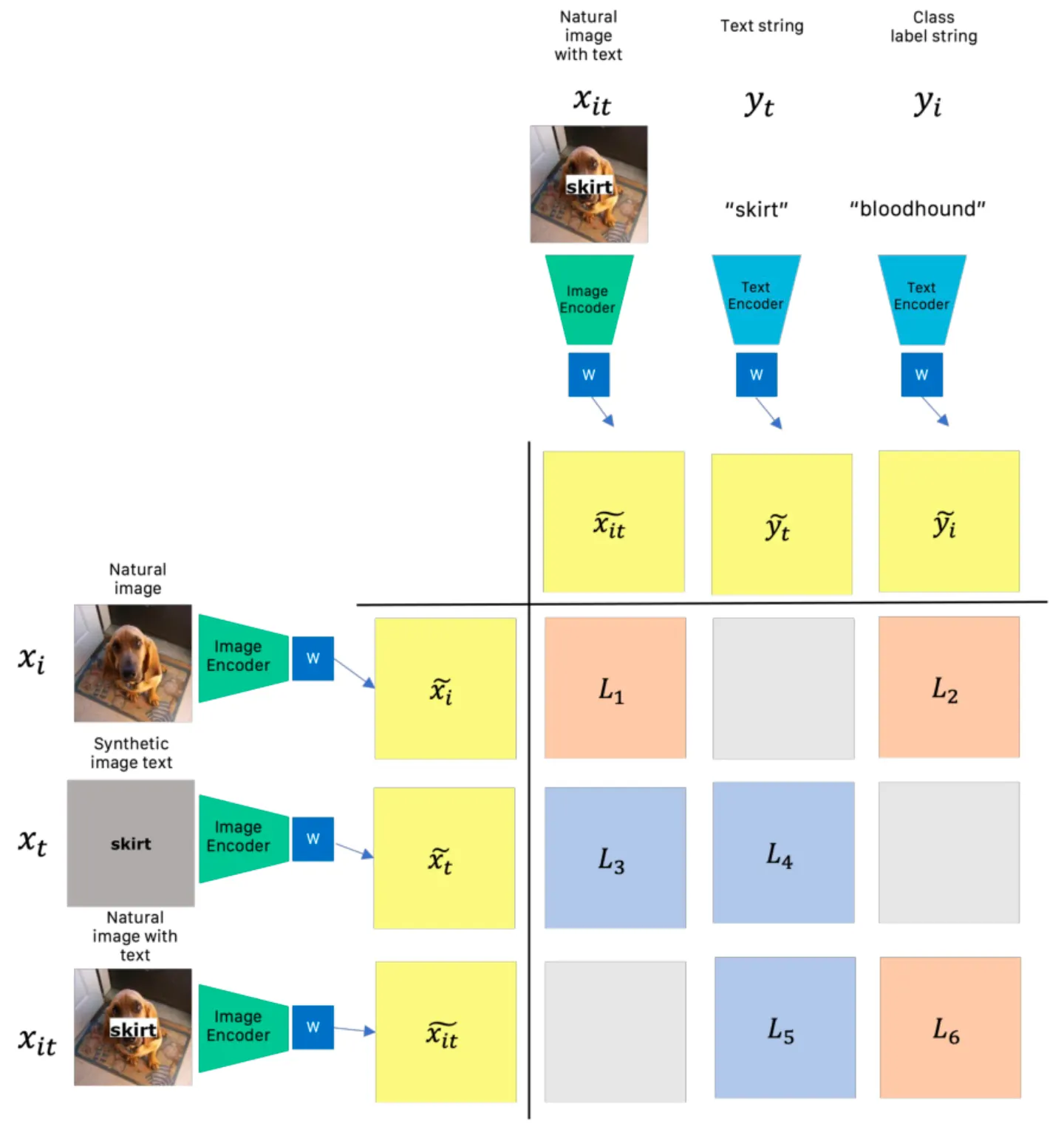 Spelling 을 할 수 없도록 추가적으로 학습하기 위해서는 Image Text 와 Text String 의 유사도 개념을 포함하고 있는 쌍들은 유사도가 작도록 (loss 가 크도록), Natural Image 와 Text String 의 유사도 개념을 포함하고 있는 쌍들은 유사도가 크도록 (loss 가 작도록) 설계할 수 있습니다.