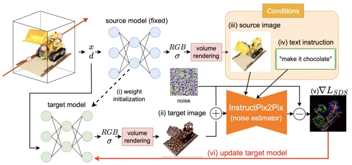 Transform “image rendered by target model” using InstructPix2Pix guided by” image rendered by source model” and text instruction for stylization