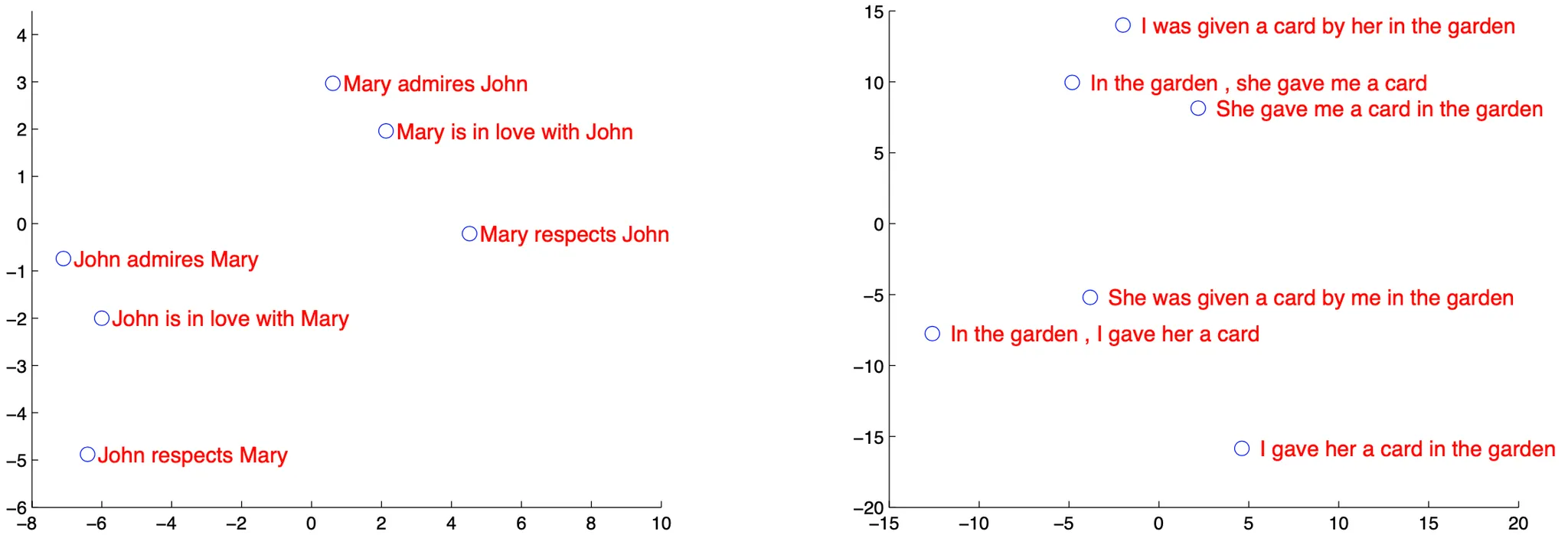 다음으로 논문에서는 학습한 모델에 특정 sentence 를 input 으로 주었을 때 산출되는 hidden state 를 PCA 를 통해서 dimension 을 2차원으로 낮춘 뒤 plotting 한 결과를 보여줍니다. 좌측의 plotting 에서 word 의 순서가 비슷한 문장을 clustering 함을 알 수 있고, 모델의 hidden state 가 word order 에 대한 학습을 진행한 것을 보였습니다. 우측의 plotting 에서는 word 의 순서가 크게 다름에도 의미가 비슷한 문장들 끼리 clustering 함을 알 수 있고, 모델의 hidden state 가 sentence meaning 에 대한 학습을 진행한 것을 보였습니다.