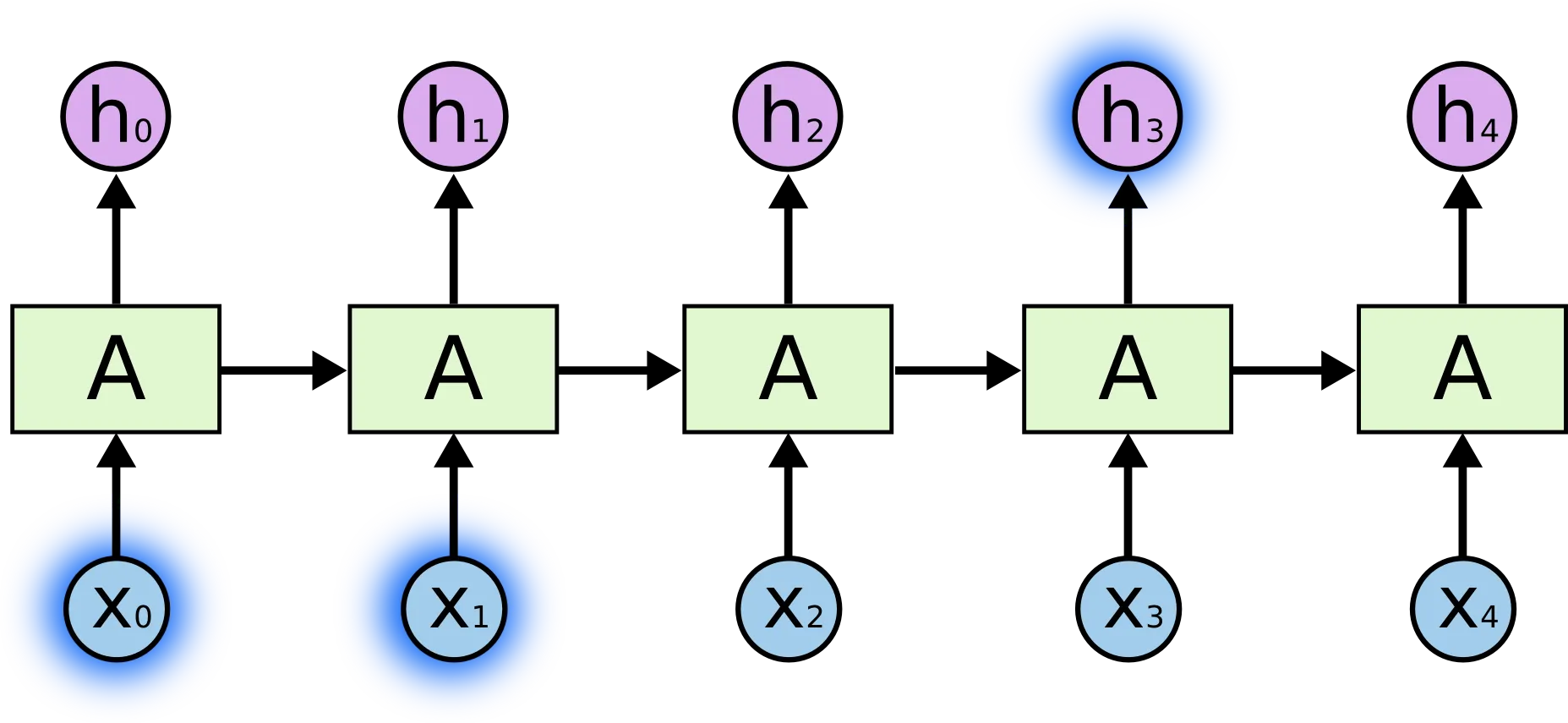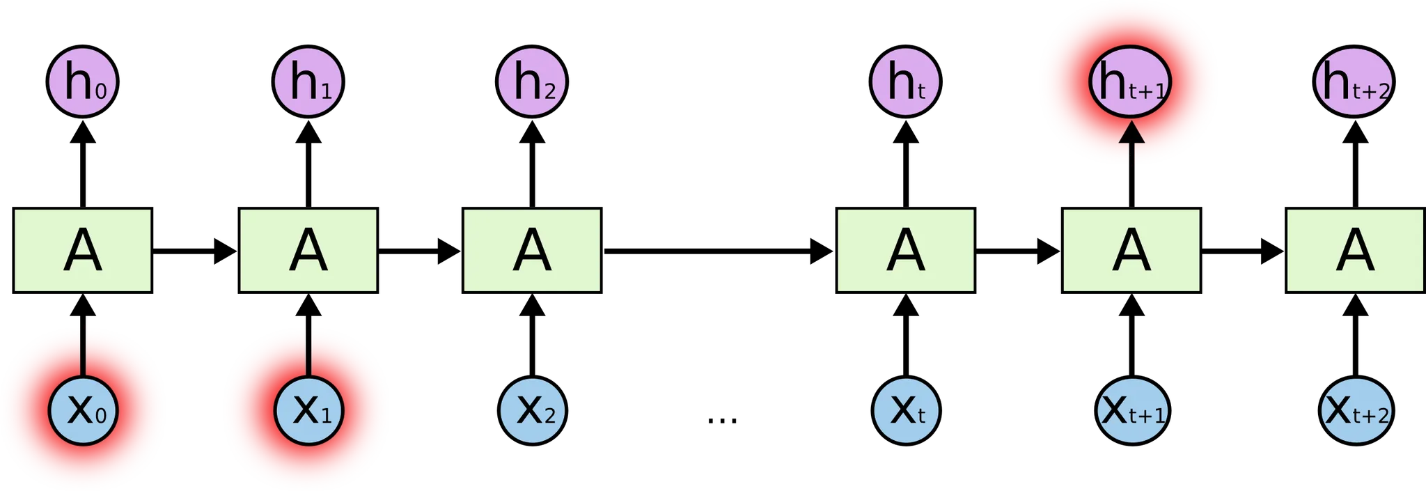 하지만, 위 그림의 와 이 에 주는 영향은 cell 간 거리가 멀기 때문에 굉장히 작습니다. 이렇게 설계될 경우, sequential data 에서 거리가 먼 곳의 두 데이터 값이 실제로 유의미한 특성을 가지고 있을 경우 모델 성능의 큰 저하로 이어질 수 있습니다. 이를 Long Term Dependency Problem 이라고 합니다.