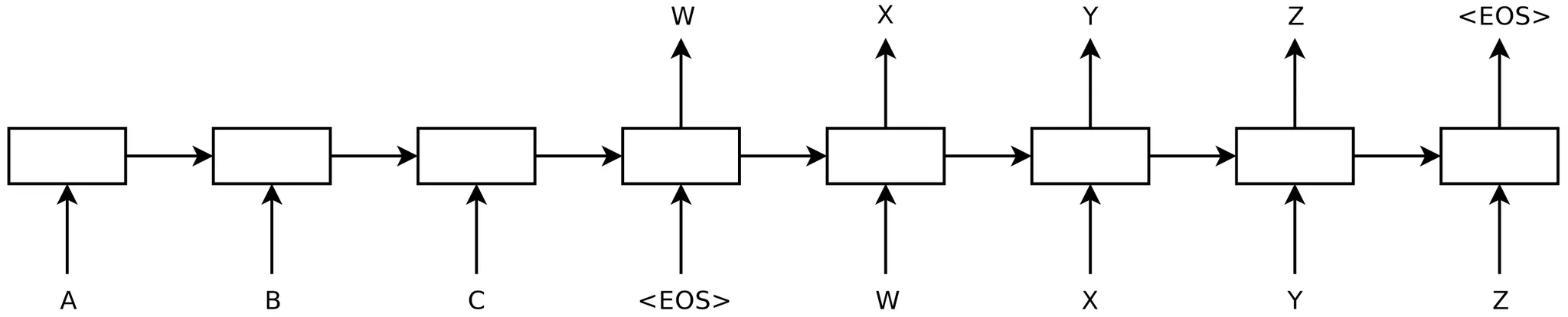위 그림이 논문에서 <EOS> symbol 을 사용한 방법입니다. <EOS> symbol 이 나타나면 그 뒤로부터 나타나는 output 을 가지고 train 에서는 loss 를 구하고, test 에서는 output 을 구하는 것입니다. 마찬가지로, <EOS> symbol 이 output 으로 나타나면 종료로 판단합니다. 위 예시에서는 ABC 라는 문장을 넣어 WXYZ 라는 문장을 얻은 것입니다.