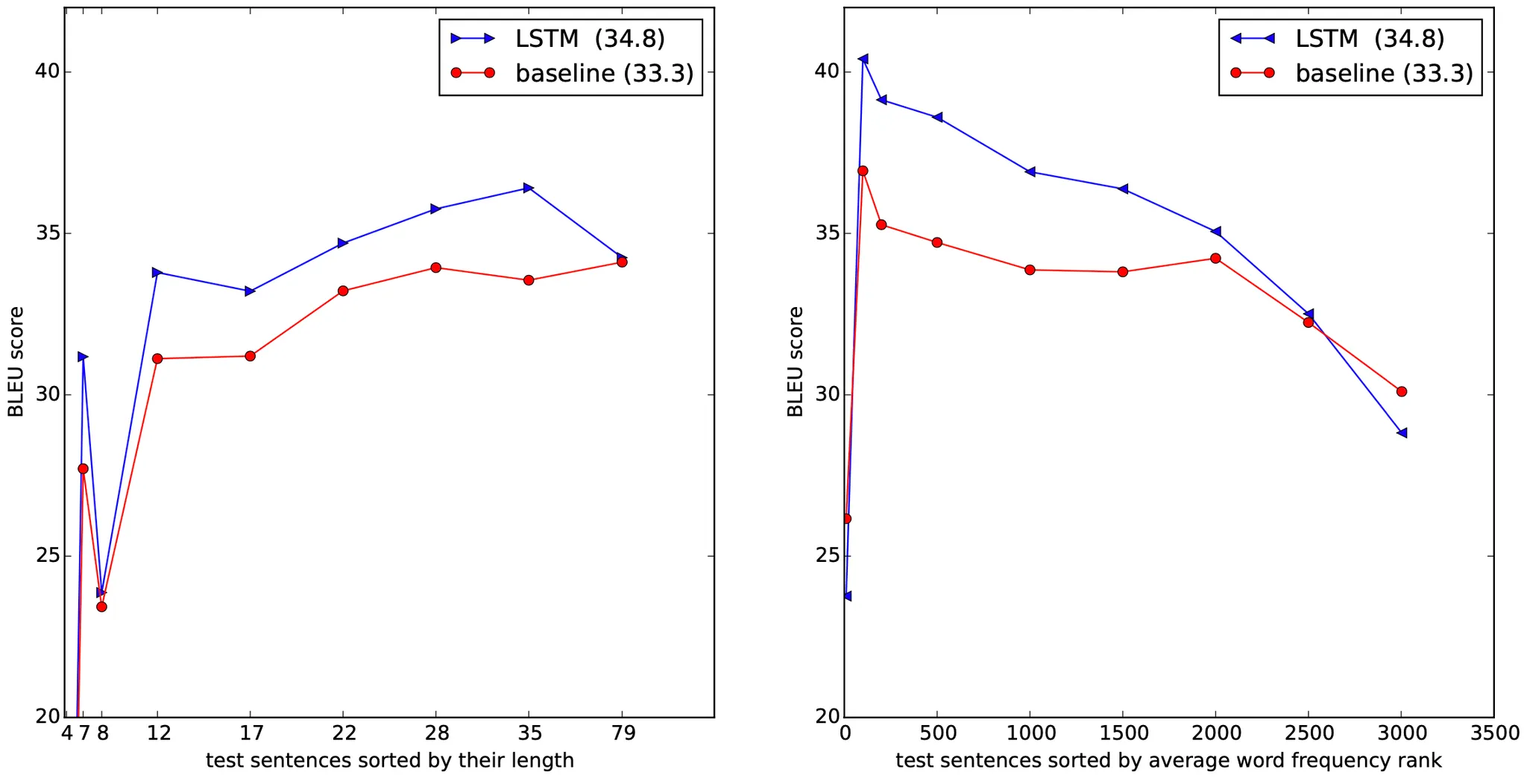 마지막으로 논문에서는 test sentence 의 길이에 따른 LSTM 과 baseline 의 성능 차이를 plotting 한 그래프를 보여줍니다. 좌측의 그래프를 통해서 길이에 따른 성능 저하가 35 words 이하에서는 일어나지 않음을 보였고, 35 words 이후에도 작은 수준임을 언급했으며 전체적으로 LSTM 이 baseline 에 비해서 우세한 성능을 보였습니다. 우측의 그래프를 통해서 자주 사용되지 않는 단어에 대해서도 성능이 기존에 비해 크게 떨어지지 않음은 물론 baseline 보다 높은 성능을 보임을 알 수 있었습니다.
