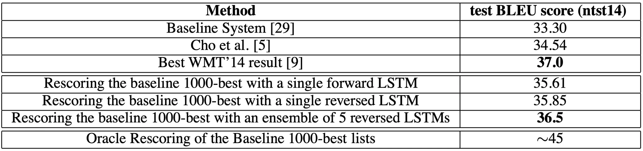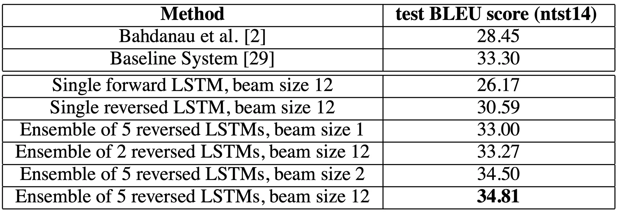 이게 무슨 소리냐 하면... 원래는 ABC 로 input sequence 를 넣었다면 CBA 로 input sequence 를 넣는 것으로 바꾸었다는 것입니다. (A, B, C 각각이 word 입니다.) 이러한 시도는 SGD 가 input-output 간의 관계 설립하기 쉽도록 만들어 주었습니다. 이 내용은 뒤에서도 서술됩니다.