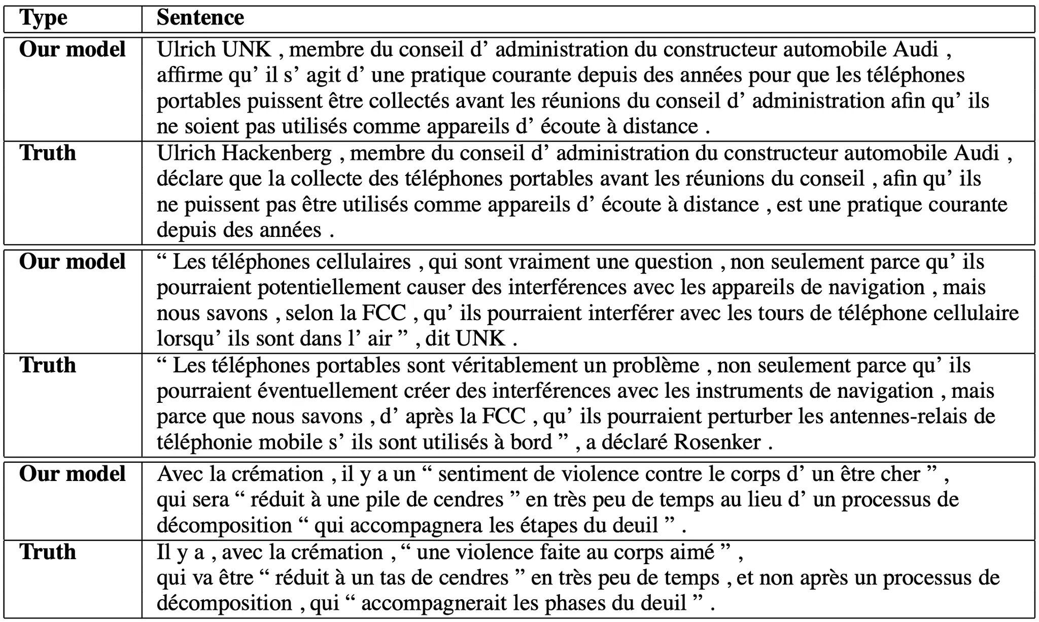 다음으로 논문에서는 그들의 모델이 long sentence 에 대한 translation 에도 좋은 성능을 보인다는 것을 정성적으로 보이기 위해 위 표와 같은 예시를 제공합니다. French 를 잘 몰라서 정확히 보기는 어렵지만... 문장이 꽤나 긺에도 어느정도 비슷한 것 같다는 느낌이 듭니다.