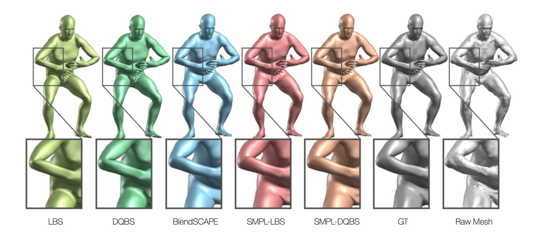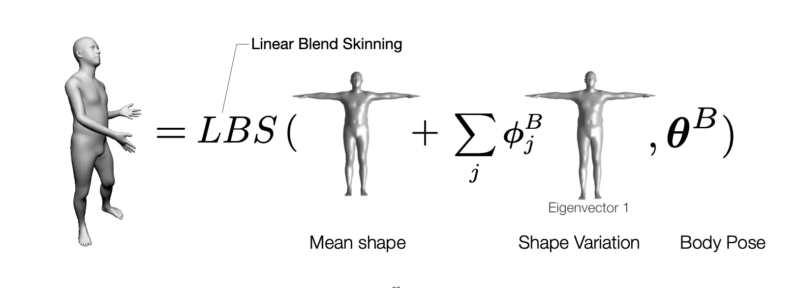 SMPL 은 추가적인 parameter 를 사용하여 pose 에 따른 shape 을 보정하여 더 자연스러운 pose 를 표현할 수 있도록 함. (pose-dependent blend-shape)