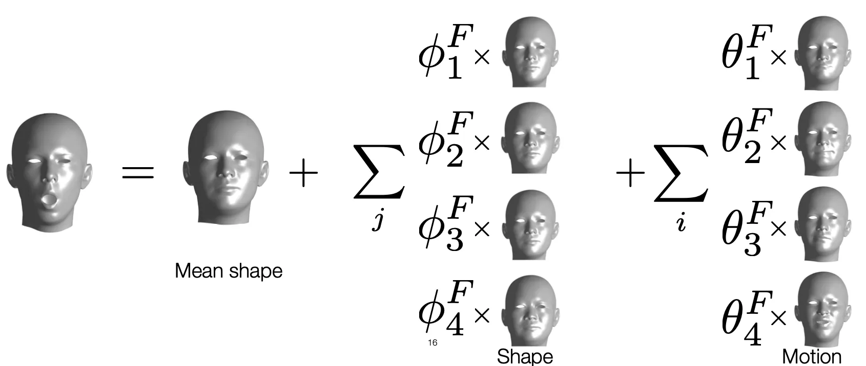 마찬가지로 특정 수 (reasonable number) 의 basis 를 두고 앞에 coefficient 를 두어 이들의 선형결합으로 표정의 변화를 표현할 수 있음. (Motion)