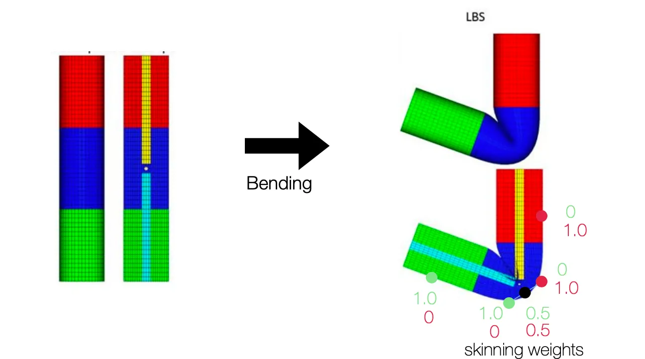 구부러지는 영역은 pre-defined parameters (vertices 마다 지정, Skinning Weight) 를 이용하여 skeleton 의 angle 에 따른 위치를 해당 parameters 의 비율로 interpolate 하여 새로운 vertex 를 찾아냄.