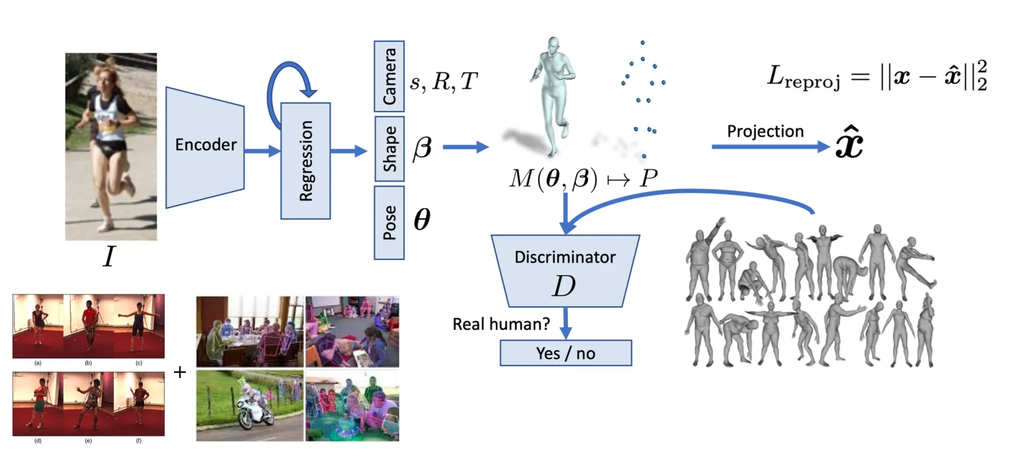Regression 한 SMPL 을 가지고 reproejction error 및 discriminator loss 로 optimize 할 수 있음.
