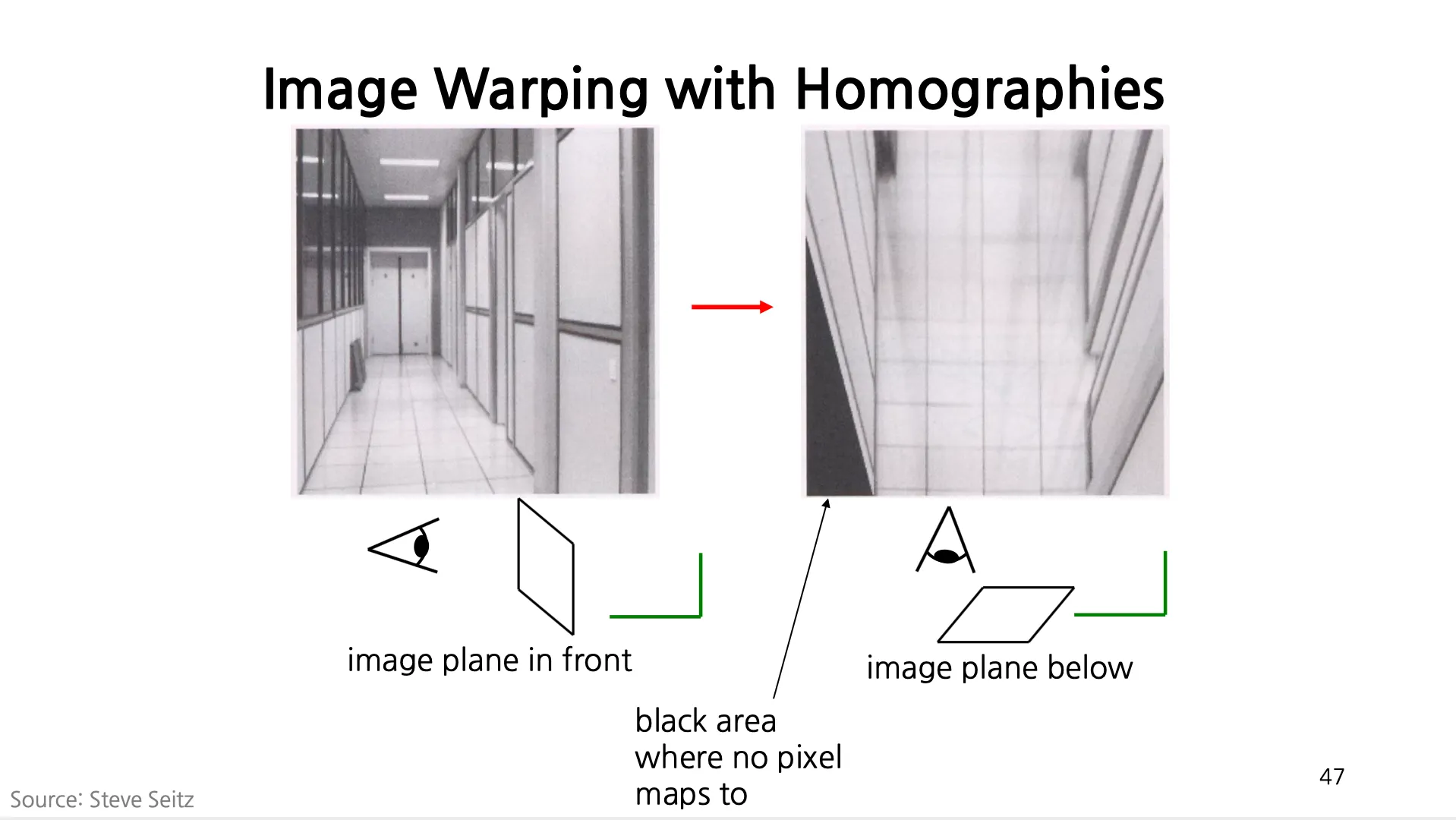 우측 그림의 검은색 영역은 Inverse Transformation 을 적용했을 때 원본 이미지의 범위 밖으로 나가서 표현될 수 없는 지역임.